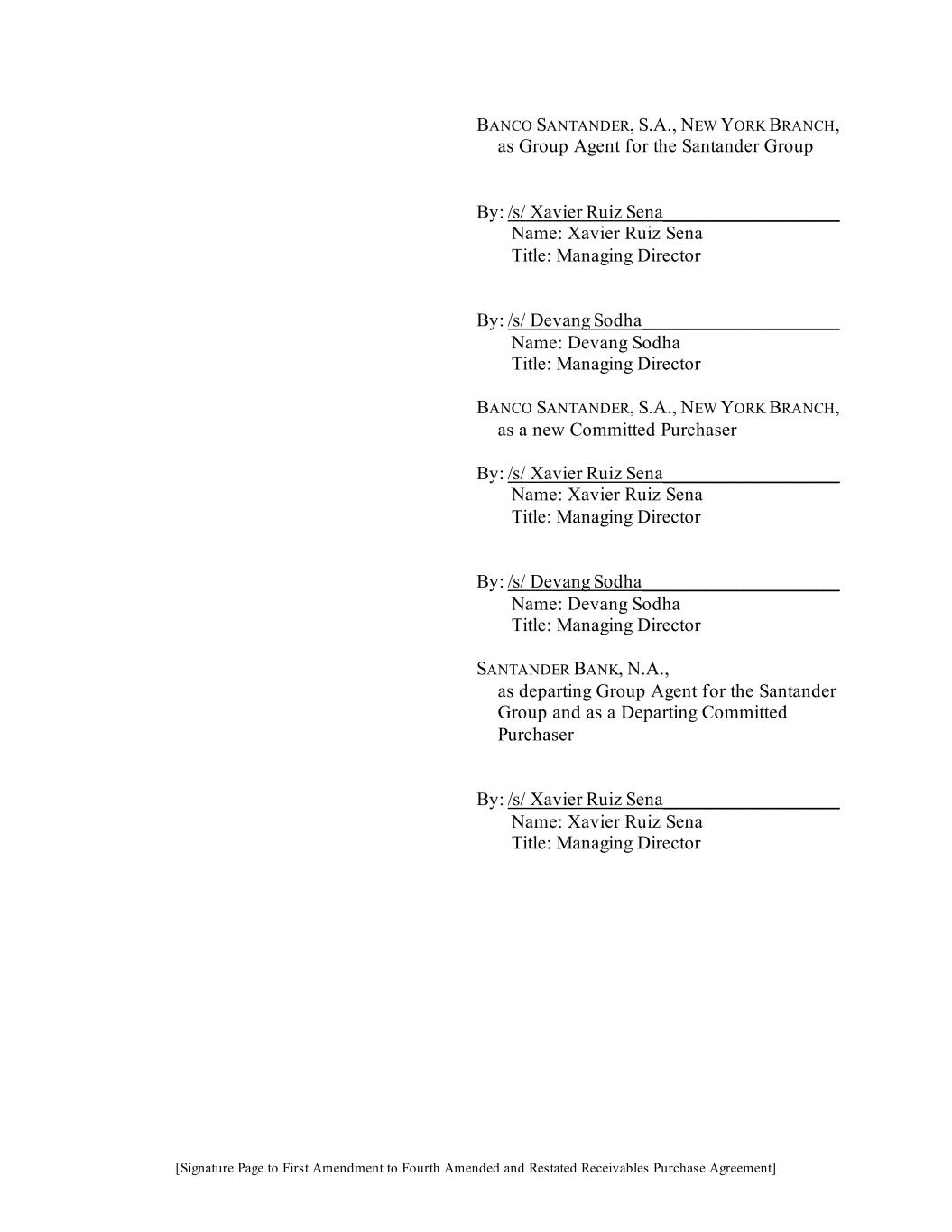 [Signature Page to First Amendment to Fourth Amended and Restated Receivables Purchase Agreement] BANCO SANTANDER, S.A., NEW YORK BRANCH, as Group Agent for the Santander Group By: /s/ Xavier Ruiz Sena__________________ Name: Xavier Ruiz Sena Title: Managing Director By: /s/ Devang Sodha____________________ Name: Devang Sodha Title: Managing Director BANCO SANTANDER, S.A., NEW YORK BRANCH, as a new Committed Purchaser By: /s/ Xavier Ruiz Sena__________________ Name: Xavier Ruiz Sena Title: Managing Director By: /s/ Devang Sodha____________________ Name: Devang Sodha Title: Managing Director SANTANDER BANK, N.A., as departing Group Agent for the Santander Group and as a Departing Committed Purchaser By: /s/ Xavier Ruiz Sena__________________ Name: Xavier Ruiz Sena Title: Managing Director