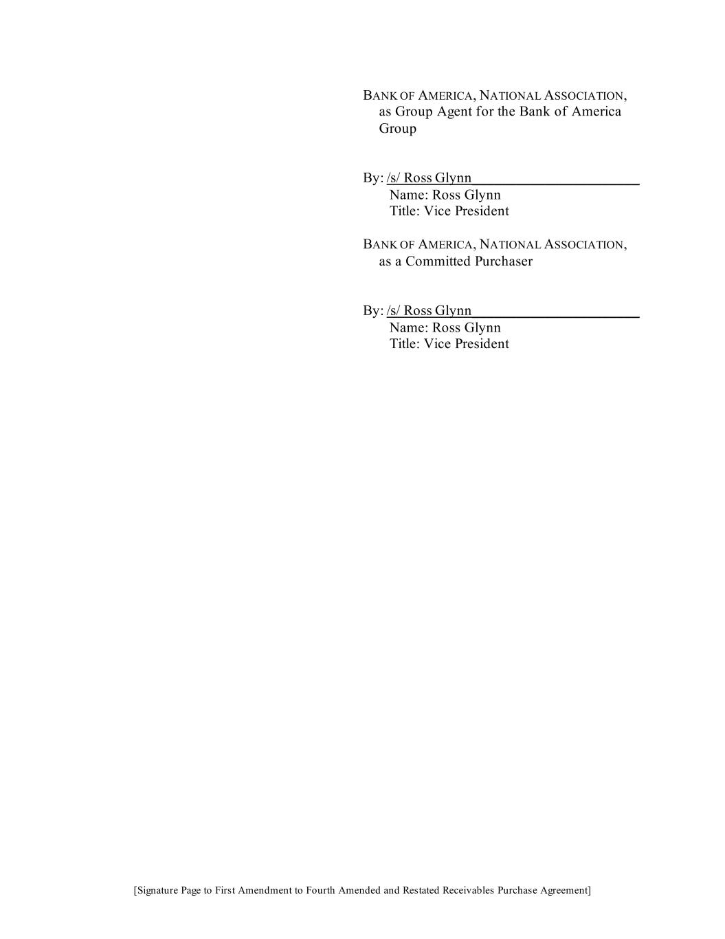 [Signature Page to First Amendment to Fourth Amended and Restated Receivables Purchase Agreement] BANK OF AMERICA, NATIONAL ASSOCIATION, as Group Agent for the Bank of America Group By: /s/ Ross Glynn_______________________ Name: Ross Glynn Title: Vice President BANK OF AMERICA, NATIONAL ASSOCIATION, as a Committed Purchaser By: /s/ Ross Glynn_______________________ Name: Ross Glynn Title: Vice President