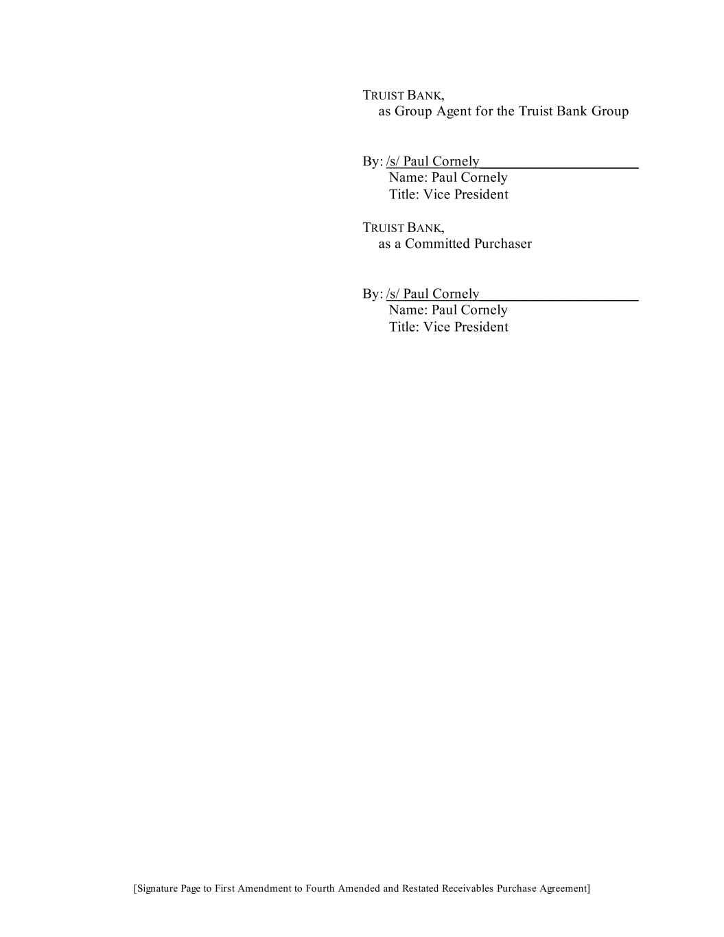 [Signature Page to First Amendment to Fourth Amended and Restated Receivables Purchase Agreement] TRUIST BANK, as Group Agent for the Truist Bank Group By: /s/ Paul Cornely______________________ Name: Paul Cornely Title: Vice President TRUIST BANK, as a Committed Purchaser By: /s/ Paul Cornely______________________ Name: Paul Cornely Title: Vice President
