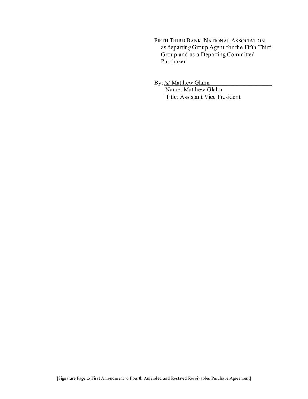 [Signature Page to First Amendment to Fourth Amended and Restated Receivables Purchase Agreement] FIFTH THIRD BANK, NATIONAL ASSOCIATION, as departing Group Agent for the Fifth Third Group and as a Departing Committed Purchaser By: /s/ Matthew Glahn____________________ Name: Matthew Glahn Title: Assistant Vice President