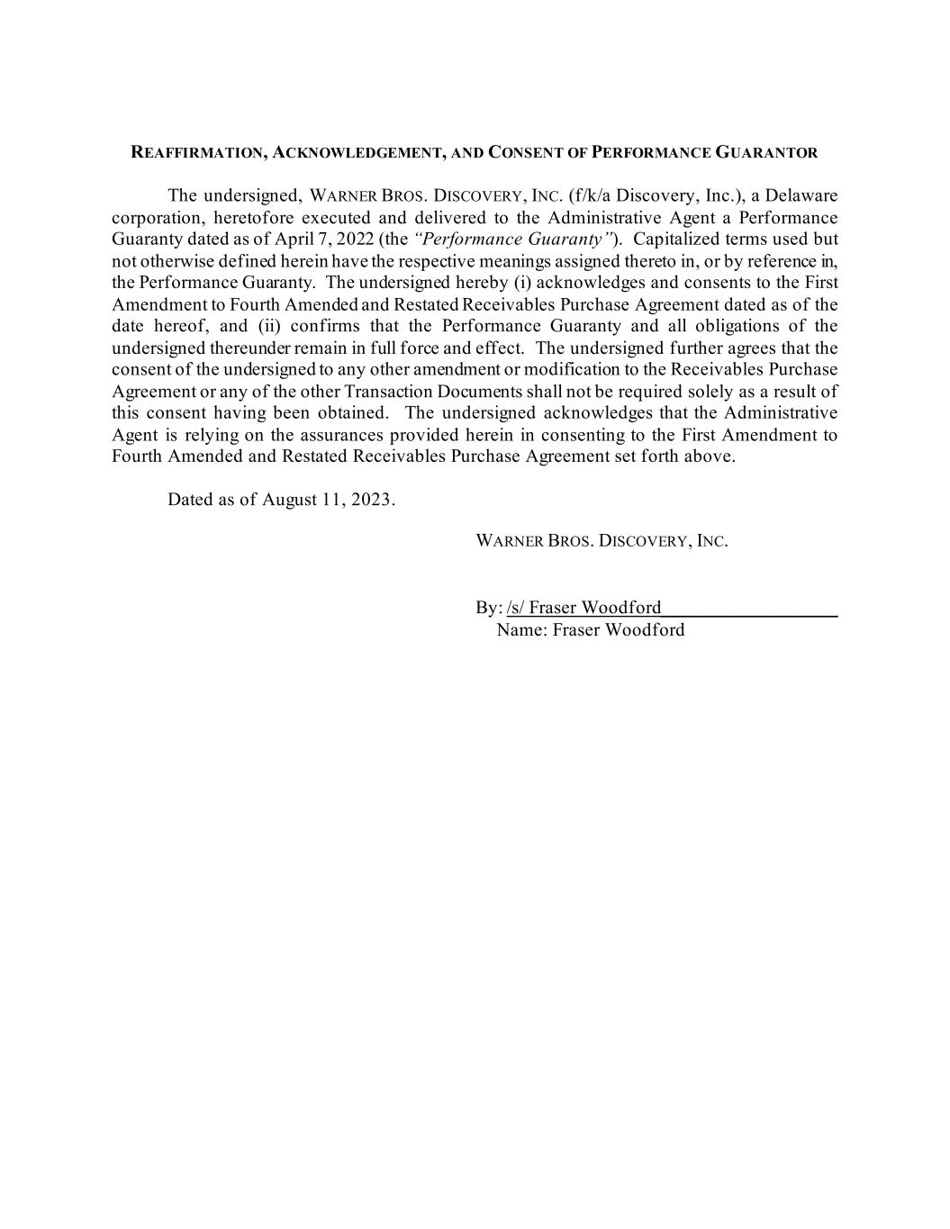 REAFFIRMATION, ACKNOWLEDGEMENT, AND CONSENT OF PERFORMANCE GUARANTOR The undersigned, WARNER BROS. DISCOVERY, INC. (f/k/a Discovery, Inc.), a Delaware corporation, heretofore executed and delivered to the Administrative Agent a Performance Guaranty dated as of April 7, 2022 (the “Performance Guaranty”). Capitalized terms used but not otherwise defined herein have the respective meanings assigned thereto in, or by reference in, the Performance Guaranty. The undersigned hereby (i) acknowledges and consents to the First Amendment to Fourth Amended and Restated Receivables Purchase Agreement dated as of the date hereof, and (ii) confirms that the Performance Guaranty and all obligations of the undersigned thereunder remain in full force and effect. The undersigned further agrees that the consent of the undersigned to any other amendment or modification to the Receivables Purchase Agreement or any of the other Transaction Documents shall not be required solely as a result of this consent having been obtained. The undersigned acknowledges that the Administrative Agent is relying on the assurances provided herein in consenting to the First Amendment to Fourth Amended and Restated Receivables Purchase Agreement set forth above. Dated as of August 11, 2023. WARNER BROS. DISCOVERY, INC. By: /s/ Fraser Woodford___________________ Name: Fraser Woodford
