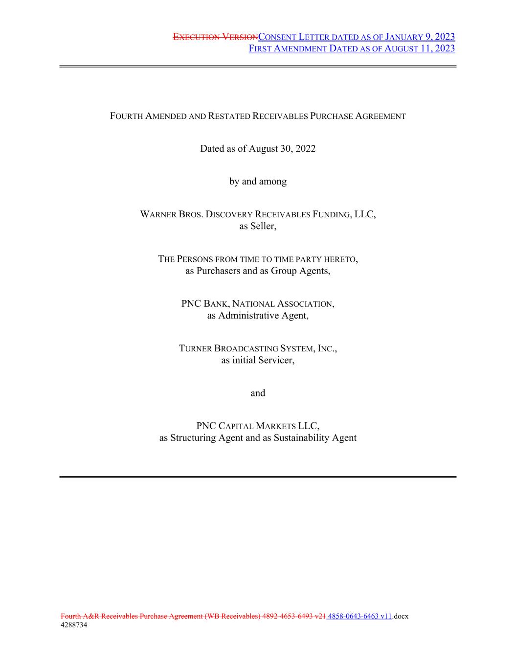 EXECUTION VERSIONCONSENT LETTER DATED AS OF JANUARY 9, 2023 FIRST AMENDMENT DATED AS OF AUGUST 11, 2023 Fourth A&R Receivables Purchase Agreement (WB Receivables) 4892-4653-6493 v21 4858-0643-6463 v11.docx 4288734 FOURTH AMENDED AND RESTATED RECEIVABLES PURCHASE AGREEMENT Dated as of August 30, 2022 by and among WARNER BROS. DISCOVERY RECEIVABLES FUNDING, LLC, as Seller, THE PERSONS FROM TIME TO TIME PARTY HERETO, as Purchasers and as Group Agents, PNC BANK, NATIONAL ASSOCIATION, as Administrative Agent, TURNER BROADCASTING SYSTEM, INC., as initial Servicer, and PNC CAPITAL MARKETS LLC, as Structuring Agent and as Sustainability Agent