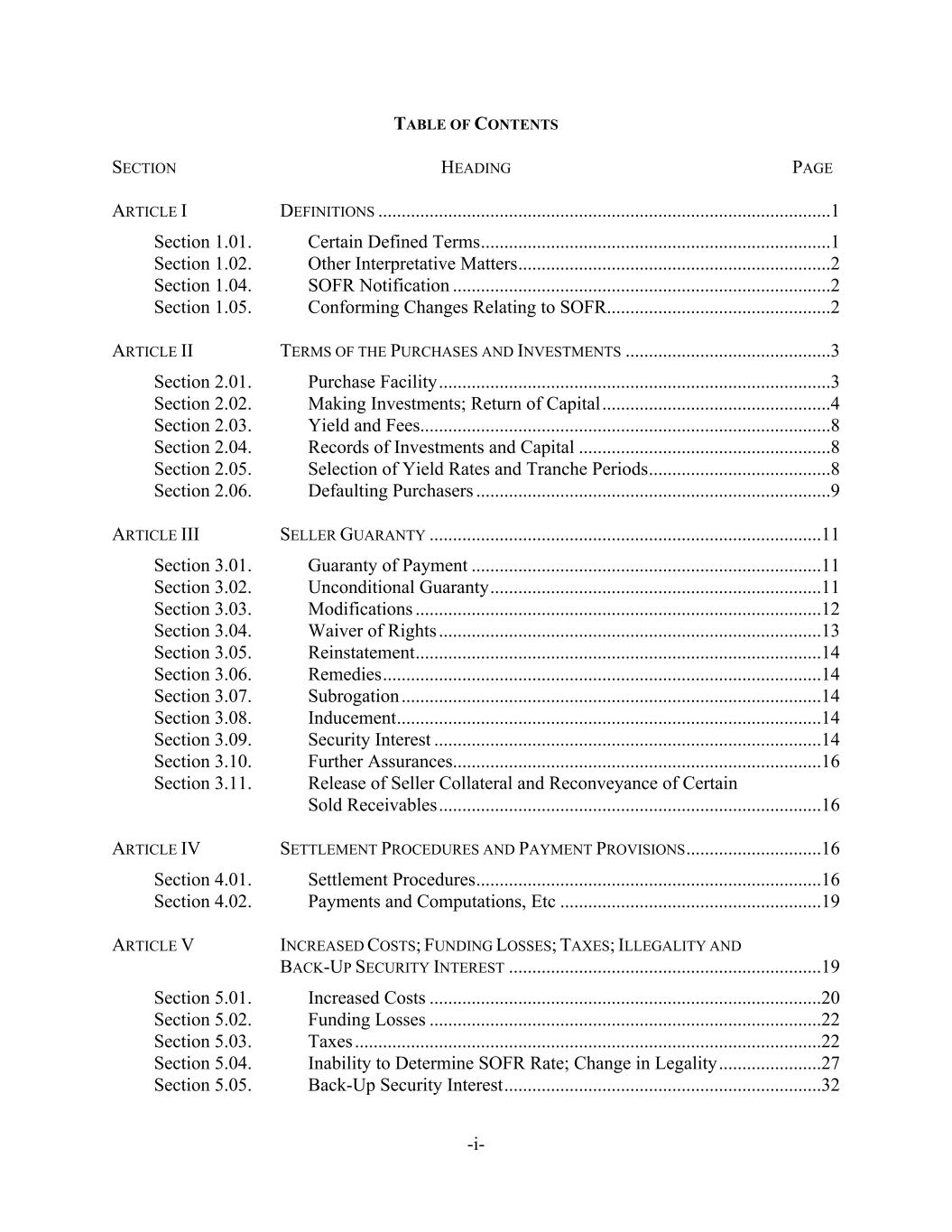 -i- TABLE OF CONTENTS SECTION HEADING PAGE ARTICLE I DEFINITIONS .................................................................................................1 Section 1.01. Certain Defined Terms...........................................................................1 Section 1.02. Other Interpretative Matters...................................................................2 Section 1.04. SOFR Notification .................................................................................2 Section 1.05. Conforming Changes Relating to SOFR................................................2 ARTICLE II TERMS OF THE PURCHASES AND INVESTMENTS ............................................3 Section 2.01. Purchase Facility....................................................................................3 Section 2.02. Making Investments; Return of Capital.................................................4 Section 2.03. Yield and Fees........................................................................................8 Section 2.04. Records of Investments and Capital ......................................................8 Section 2.05. Selection of Yield Rates and Tranche Periods.......................................8 Section 2.06. Defaulting Purchasers ............................................................................9 ARTICLE III SELLER GUARANTY ....................................................................................11 Section 3.01. Guaranty of Payment ...........................................................................11 Section 3.02. Unconditional Guaranty.......................................................................11 Section 3.03. Modifications .......................................................................................12 Section 3.04. Waiver of Rights ..................................................................................13 Section 3.05. Reinstatement.......................................................................................14 Section 3.06. Remedies..............................................................................................14 Section 3.07. Subrogation ..........................................................................................14 Section 3.08. Inducement...........................................................................................14 Section 3.09. Security Interest ...................................................................................14 Section 3.10. Further Assurances...............................................................................16 Section 3.11. Release of Seller Collateral and Reconveyance of Certain Sold Receivables..................................................................................16 ARTICLE IV SETTLEMENT PROCEDURES AND PAYMENT PROVISIONS.............................16 Section 4.01. Settlement Procedures..........................................................................16 Section 4.02. Payments and Computations, Etc ........................................................19 ARTICLE V INCREASED COSTS; FUNDING LOSSES; TAXES; ILLEGALITY AND BACK-UP SECURITY INTEREST ...................................................................19 Section 5.01. Increased Costs ....................................................................................20 Section 5.02. Funding Losses ....................................................................................22 Section 5.03. Taxes ....................................................................................................22 Section 5.04. Inability to Determine SOFR Rate; Change in Legality......................27 Section 5.05. Back-Up Security Interest....................................................................32
