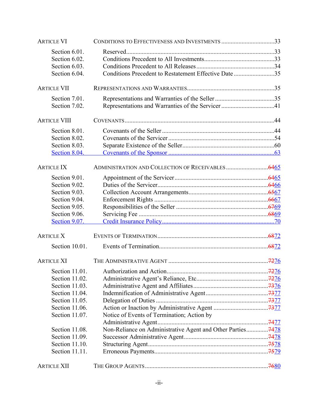-ii- ARTICLE VI CONDITIONS TO EFFECTIVENESS AND INVESTMENTS ..................................33 Section 6.01. Reserved...............................................................................................33 Section 6.02. Conditions Precedent to All Investments.............................................33 Section 6.03. Conditions Precedent to All Releases ..................................................34 Section 6.04. Conditions Precedent to Restatement Effective Date ..........................35 ARTICLE VII REPRESENTATIONS AND WARRANTIES........................................................35 Section 7.01. Representations and Warranties of the Seller ......................................35 Section 7.02. Representations and Warranties of the Servicer ..................................41 ARTICLE VIII COVENANTS................................................................................................44 Section 8.01. Covenants of the Seller ........................................................................44 Section 8.02. Covenants of the Servicer ....................................................................54 Section 8.03. Separate Existence of the Seller...........................................................60 Section 8.04. Covenants of the Sponsor ....................................................................63 ARTICLE IX ADMINISTRATION AND COLLECTION OF RECEIVABLES ...........................6465 Section 9.01. Appointment of the Servicer............................................................6465 Section 9.02. Duties of the Servicer.......................................................................6466 Section 9.03. Collection Account Arrangements...................................................6567 Section 9.04. Enforcement Rights .........................................................................6667 Section 9.05. Responsibilities of the Seller ...........................................................6769 Section 9.06. Servicing Fee ...................................................................................6869 Section 9.07. Credit Insurance Policy........................................................................70 ARTICLE X EVENTS OF TERMINATION.......................................................................6872 Section 10.01. Events of Termination......................................................................6872 ARTICLE XI THE ADMINISTRATIVE AGENT ................................................................7276 Section 11.01. Authorization and Action.................................................................7276 Section 11.02. Administrative Agent’s Reliance, Etc..............................................7276 Section 11.03. Administrative Agent and Affiliates................................................7376 Section 11.04. Indemnification of Administrative Agent........................................7377 Section 11.05. Delegation of Duties ........................................................................7377 Section 11.06. Action or Inaction by Administrative Agent ...................................7377 Section 11.07. Notice of Events of Termination; Action by Administrative Agent.......................................................................7477 Section 11.08. Non-Reliance on Administrative Agent and Other Parties..............7478 Section 11.09. Successor Administrative Agent......................................................7478 Section 11.10. Structuring Agent.............................................................................7578 Section 11.11. Erroneous Payments.........................................................................7579 ARTICLE XII THE GROUP AGENTS ...............................................................................7680