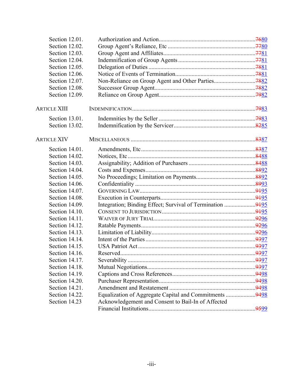 -iii- Section 12.01. Authorization and Action.................................................................7680 Section 12.02. Group Agent’s Reliance, Etc ...........................................................7780 Section 12.03. Group Agent and Affiliates..............................................................7781 Section 12.04. Indemnification of Group Agents ....................................................7781 Section 12.05. Delegation of Duties ........................................................................7881 Section 12.06. Notice of Events of Termination......................................................7881 Section 12.07. Non-Reliance on Group Agent and Other Parties............................7882 Section 12.08. Successor Group Agent....................................................................7882 Section 12.09. Reliance on Group Agent.................................................................7982 ARTICLE XIII INDEMNIFICATION...................................................................................7983 Section 13.01. Indemnities by the Seller .................................................................7983 Section 13.02. Indemnification by the Servicer.......................................................8285 ARTICLE XIV MISCELLANEOUS ....................................................................................8387 Section 14.01. Amendments, Etc.............................................................................8387 Section 14.02. Notices, Etc ......................................................................................8488 Section 14.03. Assignability; Addition of Purchasers .............................................8488 Section 14.04. Costs and Expenses..........................................................................8892 Section 14.05. No Proceedings; Limitation on Payments........................................8892 Section 14.06. Confidentiality .................................................................................8993 Section 14.07. GOVERNING LAW..............................................................................9195 Section 14.08. Execution in Counterparts................................................................9195 Section 14.09. Integration; Binding Effect; Survival of Termination .....................9195 Section 14.10. CONSENT TO JURISDICTION...............................................................9195 Section 14.11. WAIVER OF JURY TRIAL....................................................................9296 Section 14.12. Ratable Payments.............................................................................9296 Section 14.13. Limitation of Liability......................................................................9296 Section 14.14. Intent of the Parties ..........................................................................9397 Section 14.15. USA Patriot Act ...............................................................................9397 Section 14.16. Reserved...........................................................................................9397 Section 14.17. Severability ......................................................................................9397 Section 14.18. Mutual Negotiations.........................................................................9397 Section 14.19. Captions and Cross References........................................................9498 Section 14.20. Purchaser Representation.................................................................9498 Section 14.21. Amendment and Restatement ..........................................................9498 Section 14.22. Equalization of Aggregate Capital and Commitments ....................9498 Section 14.23 Acknowledgement and Consent to Bail-In of Affected Financial Institutions........................................................................9599