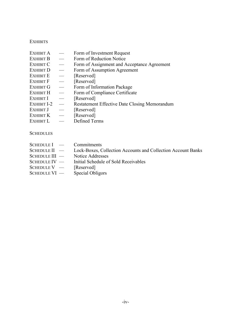 -iv- EXHIBITS EXHIBIT A — Form of Investment Request EXHIBIT B — Form of Reduction Notice EXHIBIT C — Form of Assignment and Acceptance Agreement EXHIBIT D — Form of Assumption Agreement EXHIBIT E — [Reserved] EXHIBIT F — [Reserved] EXHIBIT G — Form of Information Package EXHIBIT H — Form of Compliance Certificate EXHIBIT I — [Reserved] EXHIBIT I-2 — Restatement Effective Date Closing Memorandum EXHIBIT J — [Reserved] EXHIBIT K — [Reserved] EXHIBIT L — Defined Terms SCHEDULES SCHEDULE I — Commitments SCHEDULE II — Lock-Boxes, Collection Accounts and Collection Account Banks SCHEDULE III — Notice Addresses SCHEDULE IV — Initial Schedule of Sold Receivables SCHEDULE V — [Reserved] SCHEDULE VI — Special Obligors
