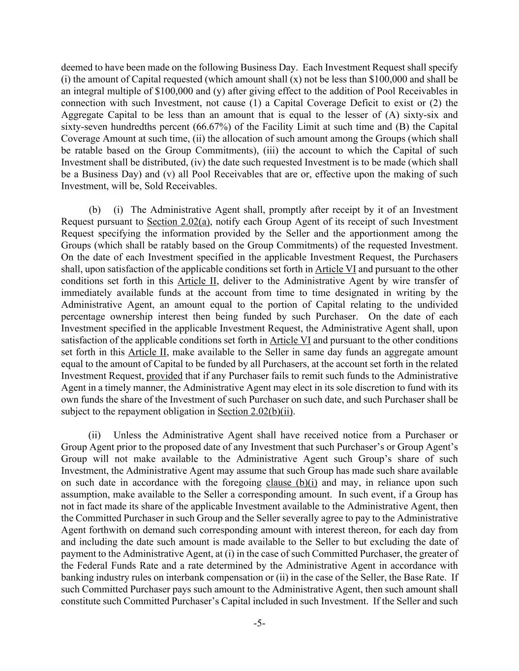 -5- deemed to have been made on the following Business Day. Each Investment Request shall specify (i) the amount of Capital requested (which amount shall (x) not be less than $100,000 and shall be an integral multiple of $100,000 and (y) after giving effect to the addition of Pool Receivables in connection with such Investment, not cause (1) a Capital Coverage Deficit to exist or (2) the Aggregate Capital to be less than an amount that is equal to the lesser of (A) sixty-six and sixty-seven hundredths percent (66.67%) of the Facility Limit at such time and (B) the Capital Coverage Amount at such time, (ii) the allocation of such amount among the Groups (which shall be ratable based on the Group Commitments), (iii) the account to which the Capital of such Investment shall be distributed, (iv) the date such requested Investment is to be made (which shall be a Business Day) and (v) all Pool Receivables that are or, effective upon the making of such Investment, will be, Sold Receivables. (b) (i) The Administrative Agent shall, promptly after receipt by it of an Investment Request pursuant to Section 2.02(a), notify each Group Agent of its receipt of such Investment Request specifying the information provided by the Seller and the apportionment among the Groups (which shall be ratably based on the Group Commitments) of the requested Investment. On the date of each Investment specified in the applicable Investment Request, the Purchasers shall, upon satisfaction of the applicable conditions set forth in Article VI and pursuant to the other conditions set forth in this Article II, deliver to the Administrative Agent by wire transfer of immediately available funds at the account from time to time designated in writing by the Administrative Agent, an amount equal to the portion of Capital relating to the undivided percentage ownership interest then being funded by such Purchaser. On the date of each Investment specified in the applicable Investment Request, the Administrative Agent shall, upon satisfaction of the applicable conditions set forth in Article VI and pursuant to the other conditions set forth in this Article II, make available to the Seller in same day funds an aggregate amount equal to the amount of Capital to be funded by all Purchasers, at the account set forth in the related Investment Request, provided that if any Purchaser fails to remit such funds to the Administrative Agent in a timely manner, the Administrative Agent may elect in its sole discretion to fund with its own funds the share of the Investment of such Purchaser on such date, and such Purchaser shall be subject to the repayment obligation in Section 2.02(b)(ii). (ii) Unless the Administrative Agent shall have received notice from a Purchaser or Group Agent prior to the proposed date of any Investment that such Purchaser’s or Group Agent’s Group will not make available to the Administrative Agent such Group’s share of such Investment, the Administrative Agent may assume that such Group has made such share available on such date in accordance with the foregoing clause (b)(i) and may, in reliance upon such assumption, make available to the Seller a corresponding amount. In such event, if a Group has not in fact made its share of the applicable Investment available to the Administrative Agent, then the Committed Purchaser in such Group and the Seller severally agree to pay to the Administrative Agent forthwith on demand such corresponding amount with interest thereon, for each day from and including the date such amount is made available to the Seller to but excluding the date of payment to the Administrative Agent, at (i) in the case of such Committed Purchaser, the greater of the Federal Funds Rate and a rate determined by the Administrative Agent in accordance with banking industry rules on interbank compensation or (ii) in the case of the Seller, the Base Rate. If such Committed Purchaser pays such amount to the Administrative Agent, then such amount shall constitute such Committed Purchaser’s Capital included in such Investment. If the Seller and such