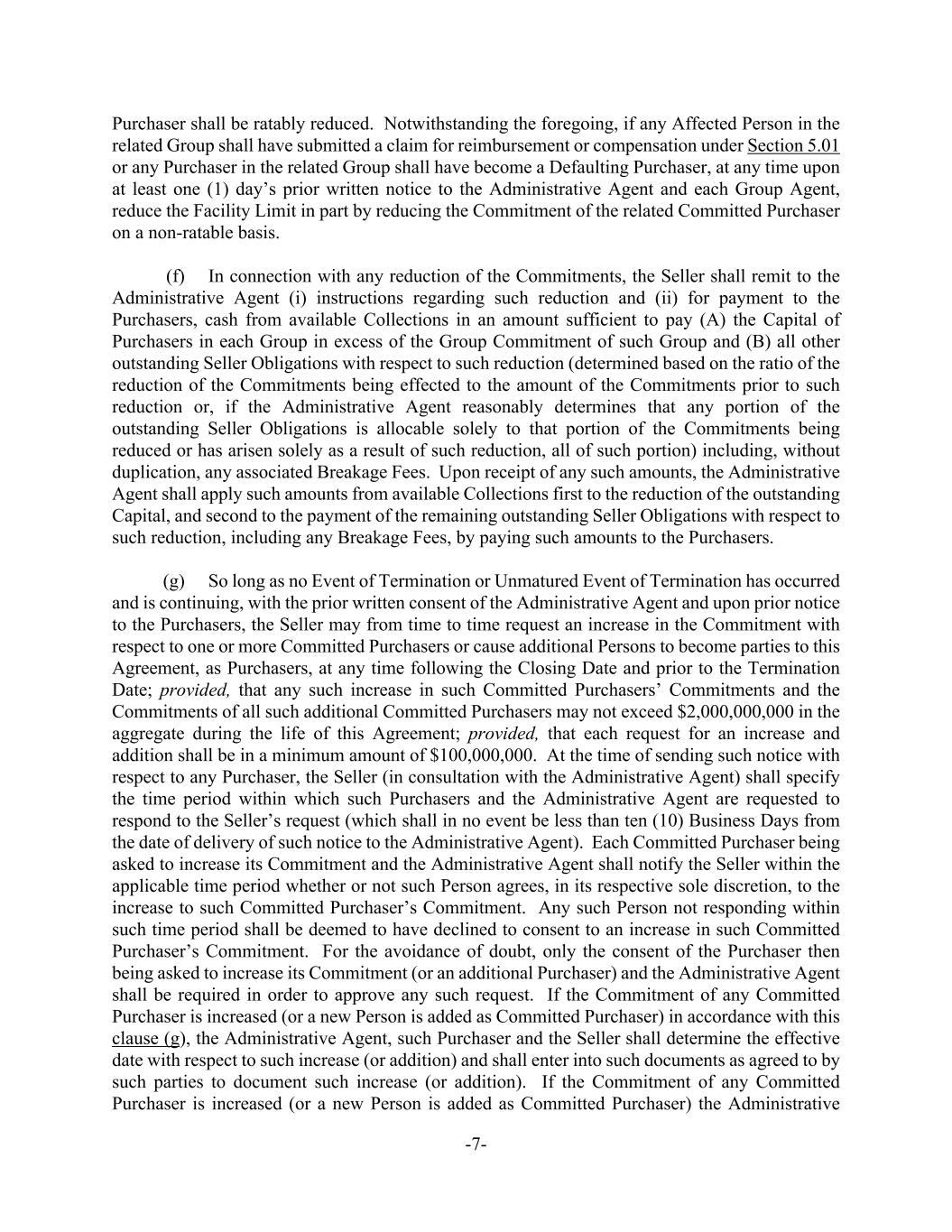 -7- Purchaser shall be ratably reduced. Notwithstanding the foregoing, if any Affected Person in the related Group shall have submitted a claim for reimbursement or compensation under Section 5.01 or any Purchaser in the related Group shall have become a Defaulting Purchaser, at any time upon at least one (1) day’s prior written notice to the Administrative Agent and each Group Agent, reduce the Facility Limit in part by reducing the Commitment of the related Committed Purchaser on a non-ratable basis. (f) In connection with any reduction of the Commitments, the Seller shall remit to the Administrative Agent (i) instructions regarding such reduction and (ii) for payment to the Purchasers, cash from available Collections in an amount sufficient to pay (A) the Capital of Purchasers in each Group in excess of the Group Commitment of such Group and (B) all other outstanding Seller Obligations with respect to such reduction (determined based on the ratio of the reduction of the Commitments being effected to the amount of the Commitments prior to such reduction or, if the Administrative Agent reasonably determines that any portion of the outstanding Seller Obligations is allocable solely to that portion of the Commitments being reduced or has arisen solely as a result of such reduction, all of such portion) including, without duplication, any associated Breakage Fees. Upon receipt of any such amounts, the Administrative Agent shall apply such amounts from available Collections first to the reduction of the outstanding Capital, and second to the payment of the remaining outstanding Seller Obligations with respect to such reduction, including any Breakage Fees, by paying such amounts to the Purchasers. (g) So long as no Event of Termination or Unmatured Event of Termination has occurred and is continuing, with the prior written consent of the Administrative Agent and upon prior notice to the Purchasers, the Seller may from time to time request an increase in the Commitment with respect to one or more Committed Purchasers or cause additional Persons to become parties to this Agreement, as Purchasers, at any time following the Closing Date and prior to the Termination Date; provided, that any such increase in such Committed Purchasers’ Commitments and the Commitments of all such additional Committed Purchasers may not exceed $2,000,000,000 in the aggregate during the life of this Agreement; provided, that each request for an increase and addition shall be in a minimum amount of $100,000,000. At the time of sending such notice with respect to any Purchaser, the Seller (in consultation with the Administrative Agent) shall specify the time period within which such Purchasers and the Administrative Agent are requested to respond to the Seller’s request (which shall in no event be less than ten (10) Business Days from the date of delivery of such notice to the Administrative Agent). Each Committed Purchaser being asked to increase its Commitment and the Administrative Agent shall notify the Seller within the applicable time period whether or not such Person agrees, in its respective sole discretion, to the increase to such Committed Purchaser’s Commitment. Any such Person not responding within such time period shall be deemed to have declined to consent to an increase in such Committed Purchaser’s Commitment. For the avoidance of doubt, only the consent of the Purchaser then being asked to increase its Commitment (or an additional Purchaser) and the Administrative Agent shall be required in order to approve any such request. If the Commitment of any Committed Purchaser is increased (or a new Person is added as Committed Purchaser) in accordance with this clause (g), the Administrative Agent, such Purchaser and the Seller shall determine the effective date with respect to such increase (or addition) and shall enter into such documents as agreed to by such parties to document such increase (or addition). If the Commitment of any Committed Purchaser is increased (or a new Person is added as Committed Purchaser) the Administrative