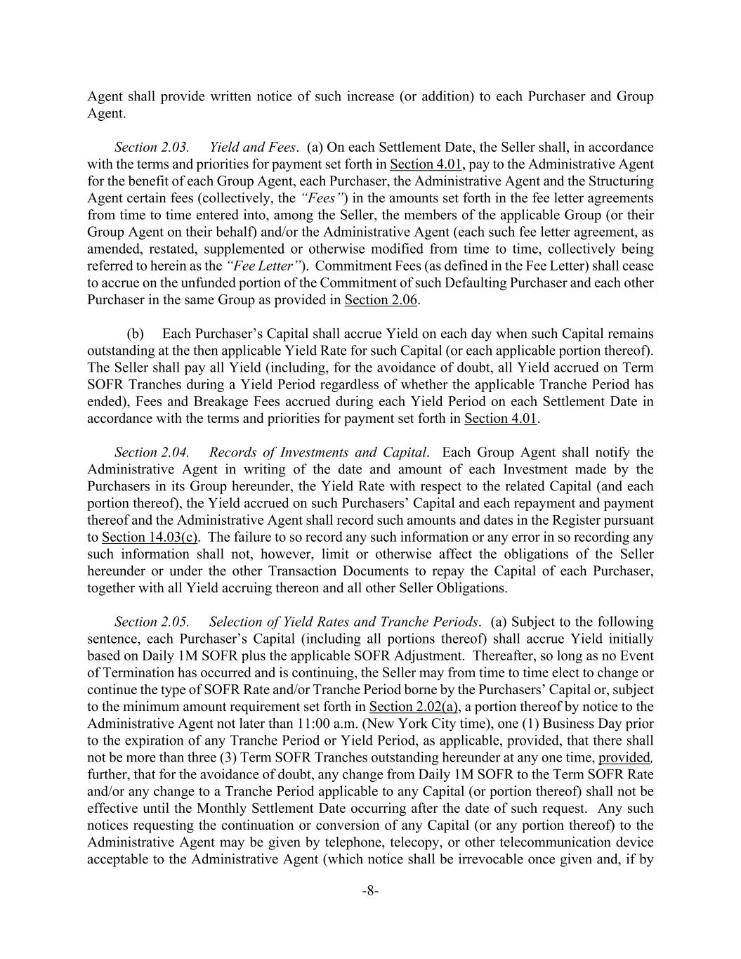 -8- Agent shall provide written notice of such increase (or addition) to each Purchaser and Group Agent. Section 2.03. Yield and Fees. (a) On each Settlement Date, the Seller shall, in accordance with the terms and priorities for payment set forth in Section 4.01, pay to the Administrative Agent for the benefit of each Group Agent, each Purchaser, the Administrative Agent and the Structuring Agent certain fees (collectively, the “Fees”) in the amounts set forth in the fee letter agreements from time to time entered into, among the Seller, the members of the applicable Group (or their Group Agent on their behalf) and/or the Administrative Agent (each such fee letter agreement, as amended, restated, supplemented or otherwise modified from time to time, collectively being referred to herein as the “Fee Letter”). Commitment Fees (as defined in the Fee Letter) shall cease to accrue on the unfunded portion of the Commitment of such Defaulting Purchaser and each other Purchaser in the same Group as provided in Section 2.06. (b) Each Purchaser’s Capital shall accrue Yield on each day when such Capital remains outstanding at the then applicable Yield Rate for such Capital (or each applicable portion thereof). The Seller shall pay all Yield (including, for the avoidance of doubt, all Yield accrued on Term SOFR Tranches during a Yield Period regardless of whether the applicable Tranche Period has ended), Fees and Breakage Fees accrued during each Yield Period on each Settlement Date in accordance with the terms and priorities for payment set forth in Section 4.01. Section 2.04. Records of Investments and Capital. Each Group Agent shall notify the Administrative Agent in writing of the date and amount of each Investment made by the Purchasers in its Group hereunder, the Yield Rate with respect to the related Capital (and each portion thereof), the Yield accrued on such Purchasers’ Capital and each repayment and payment thereof and the Administrative Agent shall record such amounts and dates in the Register pursuant to Section 14.03(c). The failure to so record any such information or any error in so recording any such information shall not, however, limit or otherwise affect the obligations of the Seller hereunder or under the other Transaction Documents to repay the Capital of each Purchaser, together with all Yield accruing thereon and all other Seller Obligations. Section 2.05. Selection of Yield Rates and Tranche Periods. (a) Subject to the following sentence, each Purchaser’s Capital (including all portions thereof) shall accrue Yield initially based on Daily 1M SOFR plus the applicable SOFR Adjustment. Thereafter, so long as no Event of Termination has occurred and is continuing, the Seller may from time to time elect to change or continue the type of SOFR Rate and/or Tranche Period borne by the Purchasers’ Capital or, subject to the minimum amount requirement set forth in Section 2.02(a), a portion thereof by notice to the Administrative Agent not later than 11:00 a.m. (New York City time), one (1) Business Day prior to the expiration of any Tranche Period or Yield Period, as applicable, provided, that there shall not be more than three (3) Term SOFR Tranches outstanding hereunder at any one time, provided, further, that for the avoidance of doubt, any change from Daily 1M SOFR to the Term SOFR Rate and/or any change to a Tranche Period applicable to any Capital (or portion thereof) shall not be effective until the Monthly Settlement Date occurring after the date of such request. Any such notices requesting the continuation or conversion of any Capital (or any portion thereof) to the Administrative Agent may be given by telephone, telecopy, or other telecommunication device acceptable to the Administrative Agent (which notice shall be irrevocable once given and, if by