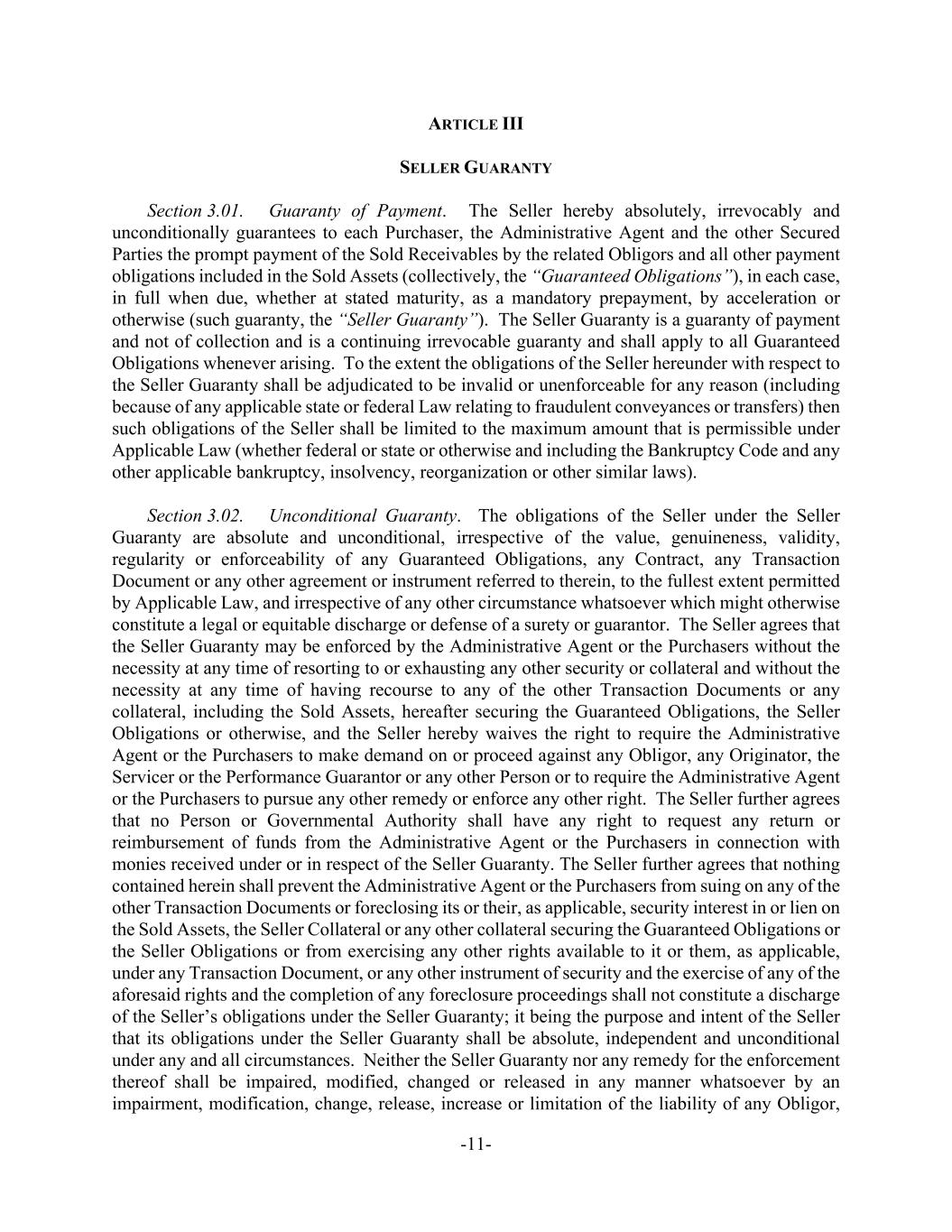 -11- ARTICLE III SELLER GUARANTY Section 3.01. Guaranty of Payment. The Seller hereby absolutely, irrevocably and unconditionally guarantees to each Purchaser, the Administrative Agent and the other Secured Parties the prompt payment of the Sold Receivables by the related Obligors and all other payment obligations included in the Sold Assets (collectively, the “Guaranteed Obligations”), in each case, in full when due, whether at stated maturity, as a mandatory prepayment, by acceleration or otherwise (such guaranty, the “Seller Guaranty”). The Seller Guaranty is a guaranty of payment and not of collection and is a continuing irrevocable guaranty and shall apply to all Guaranteed Obligations whenever arising. To the extent the obligations of the Seller hereunder with respect to the Seller Guaranty shall be adjudicated to be invalid or unenforceable for any reason (including because of any applicable state or federal Law relating to fraudulent conveyances or transfers) then such obligations of the Seller shall be limited to the maximum amount that is permissible under Applicable Law (whether federal or state or otherwise and including the Bankruptcy Code and any other applicable bankruptcy, insolvency, reorganization or other similar laws). Section 3.02. Unconditional Guaranty. The obligations of the Seller under the Seller Guaranty are absolute and unconditional, irrespective of the value, genuineness, validity, regularity or enforceability of any Guaranteed Obligations, any Contract, any Transaction Document or any other agreement or instrument referred to therein, to the fullest extent permitted by Applicable Law, and irrespective of any other circumstance whatsoever which might otherwise constitute a legal or equitable discharge or defense of a surety or guarantor. The Seller agrees that the Seller Guaranty may be enforced by the Administrative Agent or the Purchasers without the necessity at any time of resorting to or exhausting any other security or collateral and without the necessity at any time of having recourse to any of the other Transaction Documents or any collateral, including the Sold Assets, hereafter securing the Guaranteed Obligations, the Seller Obligations or otherwise, and the Seller hereby waives the right to require the Administrative Agent or the Purchasers to make demand on or proceed against any Obligor, any Originator, the Servicer or the Performance Guarantor or any other Person or to require the Administrative Agent or the Purchasers to pursue any other remedy or enforce any other right. The Seller further agrees that no Person or Governmental Authority shall have any right to request any return or reimbursement of funds from the Administrative Agent or the Purchasers in connection with monies received under or in respect of the Seller Guaranty. The Seller further agrees that nothing contained herein shall prevent the Administrative Agent or the Purchasers from suing on any of the other Transaction Documents or foreclosing its or their, as applicable, security interest in or lien on the Sold Assets, the Seller Collateral or any other collateral securing the Guaranteed Obligations or the Seller Obligations or from exercising any other rights available to it or them, as applicable, under any Transaction Document, or any other instrument of security and the exercise of any of the aforesaid rights and the completion of any foreclosure proceedings shall not constitute a discharge of the Seller’s obligations under the Seller Guaranty; it being the purpose and intent of the Seller that its obligations under the Seller Guaranty shall be absolute, independent and unconditional under any and all circumstances. Neither the Seller Guaranty nor any remedy for the enforcement thereof shall be impaired, modified, changed or released in any manner whatsoever by an impairment, modification, change, release, increase or limitation of the liability of any Obligor,