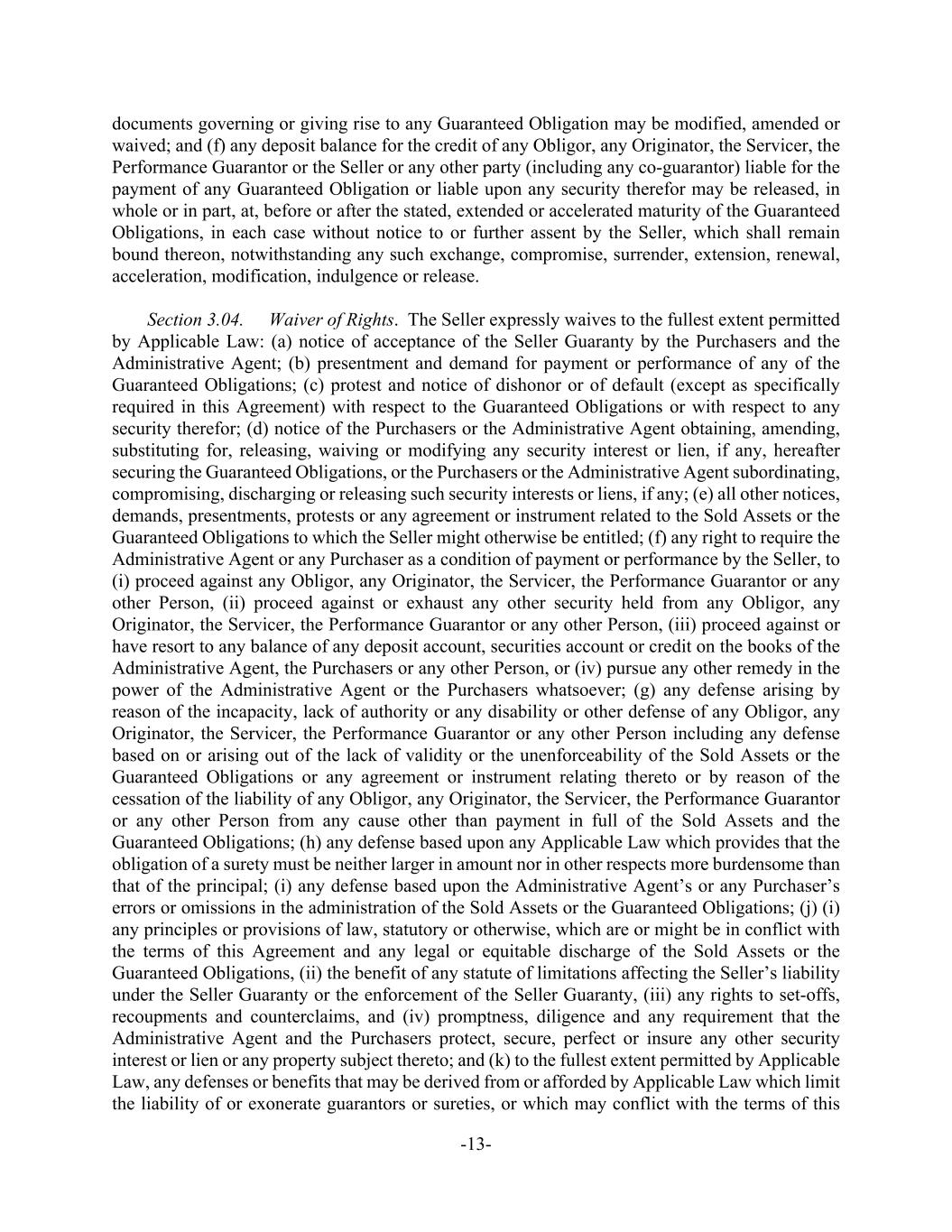 -13- documents governing or giving rise to any Guaranteed Obligation may be modified, amended or waived; and (f) any deposit balance for the credit of any Obligor, any Originator, the Servicer, the Performance Guarantor or the Seller or any other party (including any co-guarantor) liable for the payment of any Guaranteed Obligation or liable upon any security therefor may be released, in whole or in part, at, before or after the stated, extended or accelerated maturity of the Guaranteed Obligations, in each case without notice to or further assent by the Seller, which shall remain bound thereon, notwithstanding any such exchange, compromise, surrender, extension, renewal, acceleration, modification, indulgence or release. Section 3.04. Waiver of Rights. The Seller expressly waives to the fullest extent permitted by Applicable Law: (a) notice of acceptance of the Seller Guaranty by the Purchasers and the Administrative Agent; (b) presentment and demand for payment or performance of any of the Guaranteed Obligations; (c) protest and notice of dishonor or of default (except as specifically required in this Agreement) with respect to the Guaranteed Obligations or with respect to any security therefor; (d) notice of the Purchasers or the Administrative Agent obtaining, amending, substituting for, releasing, waiving or modifying any security interest or lien, if any, hereafter securing the Guaranteed Obligations, or the Purchasers or the Administrative Agent subordinating, compromising, discharging or releasing such security interests or liens, if any; (e) all other notices, demands, presentments, protests or any agreement or instrument related to the Sold Assets or the Guaranteed Obligations to which the Seller might otherwise be entitled; (f) any right to require the Administrative Agent or any Purchaser as a condition of payment or performance by the Seller, to (i) proceed against any Obligor, any Originator, the Servicer, the Performance Guarantor or any other Person, (ii) proceed against or exhaust any other security held from any Obligor, any Originator, the Servicer, the Performance Guarantor or any other Person, (iii) proceed against or have resort to any balance of any deposit account, securities account or credit on the books of the Administrative Agent, the Purchasers or any other Person, or (iv) pursue any other remedy in the power of the Administrative Agent or the Purchasers whatsoever; (g) any defense arising by reason of the incapacity, lack of authority or any disability or other defense of any Obligor, any Originator, the Servicer, the Performance Guarantor or any other Person including any defense based on or arising out of the lack of validity or the unenforceability of the Sold Assets or the Guaranteed Obligations or any agreement or instrument relating thereto or by reason of the cessation of the liability of any Obligor, any Originator, the Servicer, the Performance Guarantor or any other Person from any cause other than payment in full of the Sold Assets and the Guaranteed Obligations; (h) any defense based upon any Applicable Law which provides that the obligation of a surety must be neither larger in amount nor in other respects more burdensome than that of the principal; (i) any defense based upon the Administrative Agent’s or any Purchaser’s errors or omissions in the administration of the Sold Assets or the Guaranteed Obligations; (j) (i) any principles or provisions of law, statutory or otherwise, which are or might be in conflict with the terms of this Agreement and any legal or equitable discharge of the Sold Assets or the Guaranteed Obligations, (ii) the benefit of any statute of limitations affecting the Seller’s liability under the Seller Guaranty or the enforcement of the Seller Guaranty, (iii) any rights to set-offs, recoupments and counterclaims, and (iv) promptness, diligence and any requirement that the Administrative Agent and the Purchasers protect, secure, perfect or insure any other security interest or lien or any property subject thereto; and (k) to the fullest extent permitted by Applicable Law, any defenses or benefits that may be derived from or afforded by Applicable Law which limit the liability of or exonerate guarantors or sureties, or which may conflict with the terms of this
