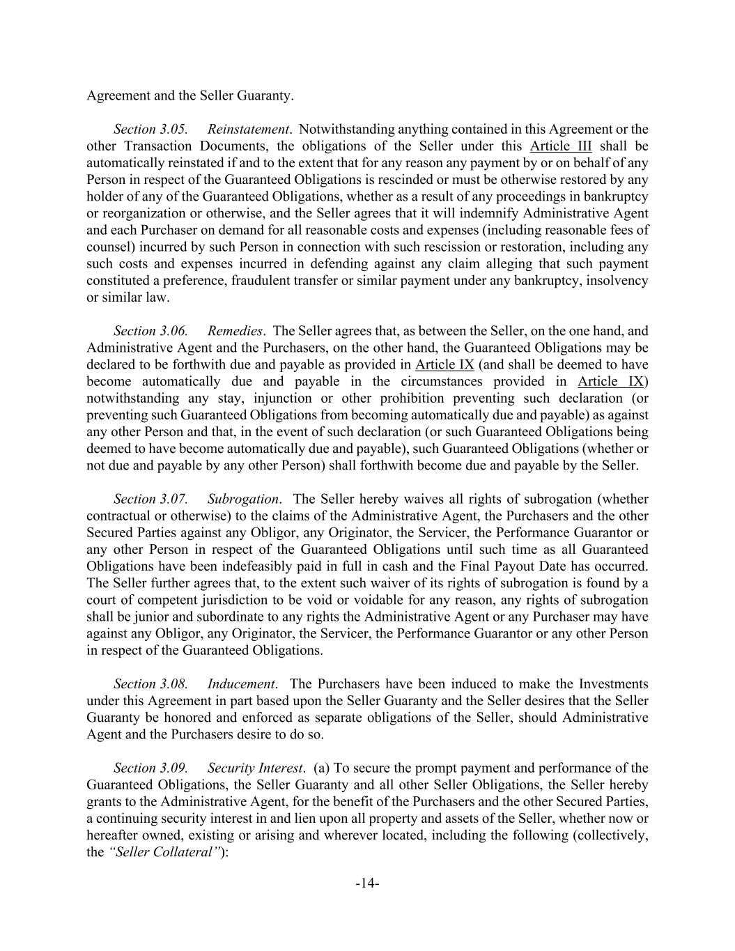 -14- Agreement and the Seller Guaranty. Section 3.05. Reinstatement. Notwithstanding anything contained in this Agreement or the other Transaction Documents, the obligations of the Seller under this Article III shall be automatically reinstated if and to the extent that for any reason any payment by or on behalf of any Person in respect of the Guaranteed Obligations is rescinded or must be otherwise restored by any holder of any of the Guaranteed Obligations, whether as a result of any proceedings in bankruptcy or reorganization or otherwise, and the Seller agrees that it will indemnify Administrative Agent and each Purchaser on demand for all reasonable costs and expenses (including reasonable fees of counsel) incurred by such Person in connection with such rescission or restoration, including any such costs and expenses incurred in defending against any claim alleging that such payment constituted a preference, fraudulent transfer or similar payment under any bankruptcy, insolvency or similar law. Section 3.06. Remedies. The Seller agrees that, as between the Seller, on the one hand, and Administrative Agent and the Purchasers, on the other hand, the Guaranteed Obligations may be declared to be forthwith due and payable as provided in Article IX (and shall be deemed to have become automatically due and payable in the circumstances provided in Article IX) notwithstanding any stay, injunction or other prohibition preventing such declaration (or preventing such Guaranteed Obligations from becoming automatically due and payable) as against any other Person and that, in the event of such declaration (or such Guaranteed Obligations being deemed to have become automatically due and payable), such Guaranteed Obligations (whether or not due and payable by any other Person) shall forthwith become due and payable by the Seller. Section 3.07. Subrogation. The Seller hereby waives all rights of subrogation (whether contractual or otherwise) to the claims of the Administrative Agent, the Purchasers and the other Secured Parties against any Obligor, any Originator, the Servicer, the Performance Guarantor or any other Person in respect of the Guaranteed Obligations until such time as all Guaranteed Obligations have been indefeasibly paid in full in cash and the Final Payout Date has occurred. The Seller further agrees that, to the extent such waiver of its rights of subrogation is found by a court of competent jurisdiction to be void or voidable for any reason, any rights of subrogation shall be junior and subordinate to any rights the Administrative Agent or any Purchaser may have against any Obligor, any Originator, the Servicer, the Performance Guarantor or any other Person in respect of the Guaranteed Obligations. Section 3.08. Inducement. The Purchasers have been induced to make the Investments under this Agreement in part based upon the Seller Guaranty and the Seller desires that the Seller Guaranty be honored and enforced as separate obligations of the Seller, should Administrative Agent and the Purchasers desire to do so. Section 3.09. Security Interest. (a) To secure the prompt payment and performance of the Guaranteed Obligations, the Seller Guaranty and all other Seller Obligations, the Seller hereby grants to the Administrative Agent, for the benefit of the Purchasers and the other Secured Parties, a continuing security interest in and lien upon all property and assets of the Seller, whether now or hereafter owned, existing or arising and wherever located, including the following (collectively, the “Seller Collateral”):