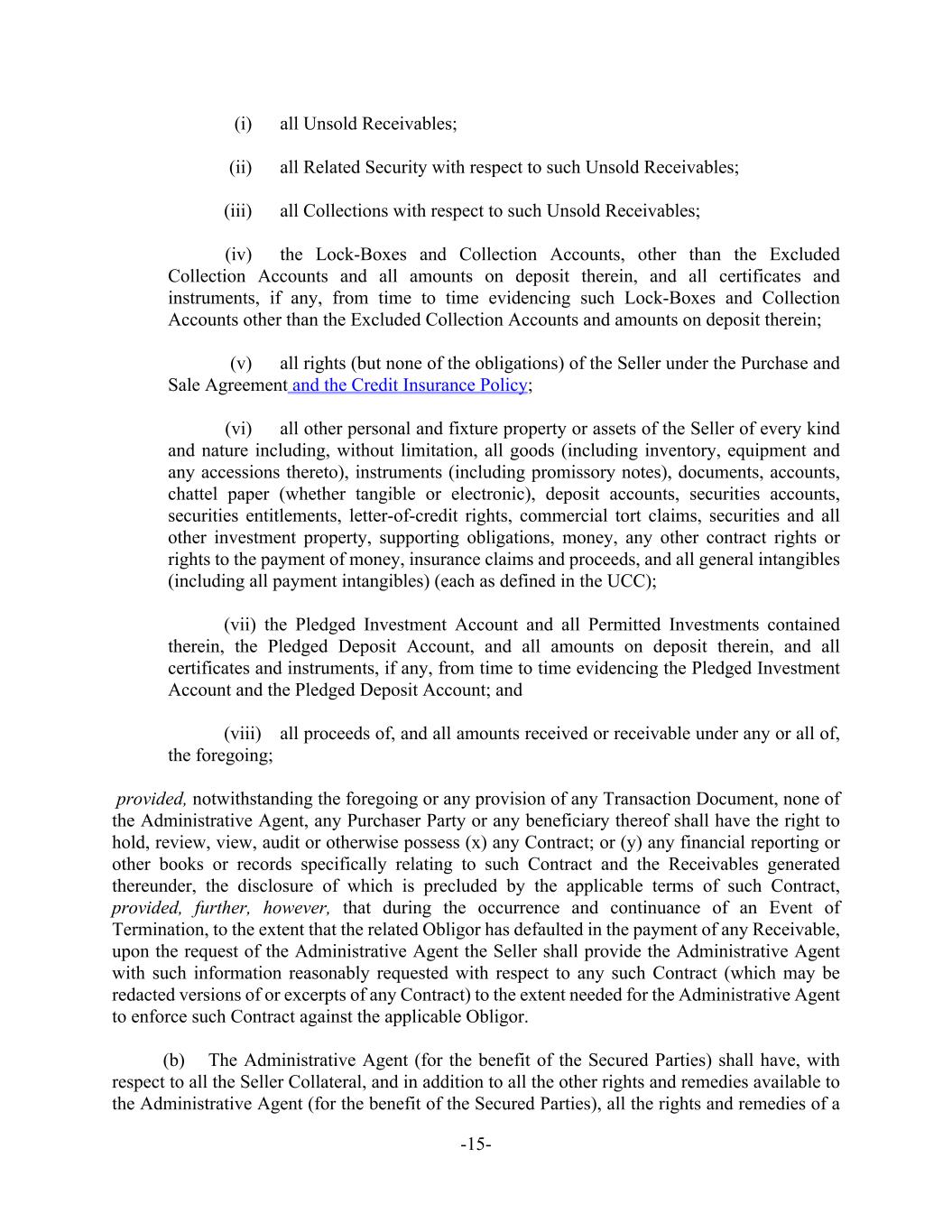 -15- (i) all Unsold Receivables; (ii) all Related Security with respect to such Unsold Receivables; (iii) all Collections with respect to such Unsold Receivables; (iv) the Lock-Boxes and Collection Accounts, other than the Excluded Collection Accounts and all amounts on deposit therein, and all certificates and instruments, if any, from time to time evidencing such Lock-Boxes and Collection Accounts other than the Excluded Collection Accounts and amounts on deposit therein; (v) all rights (but none of the obligations) of the Seller under the Purchase and Sale Agreement and the Credit Insurance Policy; (vi) all other personal and fixture property or assets of the Seller of every kind and nature including, without limitation, all goods (including inventory, equipment and any accessions thereto), instruments (including promissory notes), documents, accounts, chattel paper (whether tangible or electronic), deposit accounts, securities accounts, securities entitlements, letter-of-credit rights, commercial tort claims, securities and all other investment property, supporting obligations, money, any other contract rights or rights to the payment of money, insurance claims and proceeds, and all general intangibles (including all payment intangibles) (each as defined in the UCC); (vii) the Pledged Investment Account and all Permitted Investments contained therein, the Pledged Deposit Account, and all amounts on deposit therein, and all certificates and instruments, if any, from time to time evidencing the Pledged Investment Account and the Pledged Deposit Account; and (viii) all proceeds of, and all amounts received or receivable under any or all of, the foregoing; provided, notwithstanding the foregoing or any provision of any Transaction Document, none of the Administrative Agent, any Purchaser Party or any beneficiary thereof shall have the right to hold, review, view, audit or otherwise possess (x) any Contract; or (y) any financial reporting or other books or records specifically relating to such Contract and the Receivables generated thereunder, the disclosure of which is precluded by the applicable terms of such Contract, provided, further, however, that during the occurrence and continuance of an Event of Termination, to the extent that the related Obligor has defaulted in the payment of any Receivable, upon the request of the Administrative Agent the Seller shall provide the Administrative Agent with such information reasonably requested with respect to any such Contract (which may be redacted versions of or excerpts of any Contract) to the extent needed for the Administrative Agent to enforce such Contract against the applicable Obligor. (b) The Administrative Agent (for the benefit of the Secured Parties) shall have, with respect to all the Seller Collateral, and in addition to all the other rights and remedies available to the Administrative Agent (for the benefit of the Secured Parties), all the rights and remedies of a