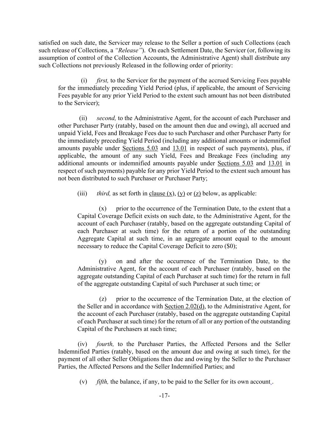 -17- satisfied on such date, the Servicer may release to the Seller a portion of such Collections (each such release of Collections, a “Release”). On each Settlement Date, the Servicer (or, following its assumption of control of the Collection Accounts, the Administrative Agent) shall distribute any such Collections not previously Released in the following order of priority: (i) first, to the Servicer for the payment of the accrued Servicing Fees payable for the immediately preceding Yield Period (plus, if applicable, the amount of Servicing Fees payable for any prior Yield Period to the extent such amount has not been distributed to the Servicer); (ii) second, to the Administrative Agent, for the account of each Purchaser and other Purchaser Party (ratably, based on the amount then due and owing), all accrued and unpaid Yield, Fees and Breakage Fees due to such Purchaser and other Purchaser Party for the immediately preceding Yield Period (including any additional amounts or indemnified amounts payable under Sections 5.03 and 13.01 in respect of such payments), plus, if applicable, the amount of any such Yield, Fees and Breakage Fees (including any additional amounts or indemnified amounts payable under Sections 5.03 and 13.01 in respect of such payments) payable for any prior Yield Period to the extent such amount has not been distributed to such Purchaser or Purchaser Party; (iii) third, as set forth in clause (x), (y) or (z) below, as applicable: (x) prior to the occurrence of the Termination Date, to the extent that a Capital Coverage Deficit exists on such date, to the Administrative Agent, for the account of each Purchaser (ratably, based on the aggregate outstanding Capital of each Purchaser at such time) for the return of a portion of the outstanding Aggregate Capital at such time, in an aggregate amount equal to the amount necessary to reduce the Capital Coverage Deficit to zero ($0); (y) on and after the occurrence of the Termination Date, to the Administrative Agent, for the account of each Purchaser (ratably, based on the aggregate outstanding Capital of each Purchaser at such time) for the return in full of the aggregate outstanding Capital of such Purchaser at such time; or (z) prior to the occurrence of the Termination Date, at the election of the Seller and in accordance with Section 2.02(d), to the Administrative Agent, for the account of each Purchaser (ratably, based on the aggregate outstanding Capital of each Purchaser at such time) for the return of all or any portion of the outstanding Capital of the Purchasers at such time; (iv) fourth, to the Purchaser Parties, the Affected Persons and the Seller Indemnified Parties (ratably, based on the amount due and owing at such time), for the payment of all other Seller Obligations then due and owing by the Seller to the Purchaser Parties, the Affected Persons and the Seller Indemnified Parties; and (v) fifth, the balance, if any, to be paid to the Seller for its own account .