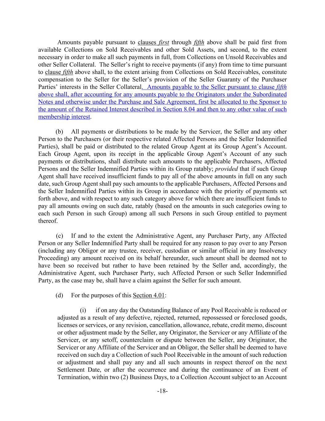 -18- Amounts payable pursuant to clauses first through fifth above shall be paid first from available Collections on Sold Receivables and other Sold Assets, and second, to the extent necessary in order to make all such payments in full, from Collections on Unsold Receivables and other Seller Collateral. The Seller’s right to receive payments (if any) from time to time pursuant to clause fifth above shall, to the extent arising from Collections on Sold Receivables, constitute compensation to the Seller for the Seller’s provision of the Seller Guaranty of the Purchaser Parties’ interests in the Seller Collateral. Amounts payable to the Seller pursuant to clause fifth above shall, after accounting for any amounts payable to the Originators under the Subordinated Notes and otherwise under the Purchase and Sale Agreement, first be allocated to the Sponsor to the amount of the Retained Interest described in Section 8.04 and then to any other value of such membership interest. (b) All payments or distributions to be made by the Servicer, the Seller and any other Person to the Purchasers (or their respective related Affected Persons and the Seller Indemnified Parties), shall be paid or distributed to the related Group Agent at its Group Agent’s Account. Each Group Agent, upon its receipt in the applicable Group Agent’s Account of any such payments or distributions, shall distribute such amounts to the applicable Purchasers, Affected Persons and the Seller Indemnified Parties within its Group ratably; provided that if such Group Agent shall have received insufficient funds to pay all of the above amounts in full on any such date, such Group Agent shall pay such amounts to the applicable Purchasers, Affected Persons and the Seller Indemnified Parties within its Group in accordance with the priority of payments set forth above, and with respect to any such category above for which there are insufficient funds to pay all amounts owing on such date, ratably (based on the amounts in such categories owing to each such Person in such Group) among all such Persons in such Group entitled to payment thereof. (c) If and to the extent the Administrative Agent, any Purchaser Party, any Affected Person or any Seller Indemnified Party shall be required for any reason to pay over to any Person (including any Obligor or any trustee, receiver, custodian or similar official in any Insolvency Proceeding) any amount received on its behalf hereunder, such amount shall be deemed not to have been so received but rather to have been retained by the Seller and, accordingly, the Administrative Agent, such Purchaser Party, such Affected Person or such Seller Indemnified Party, as the case may be, shall have a claim against the Seller for such amount. (d) For the purposes of this Section 4.01: (i) if on any day the Outstanding Balance of any Pool Receivable is reduced or adjusted as a result of any defective, rejected, returned, repossessed or foreclosed goods, licenses or services, or any revision, cancellation, allowance, rebate, credit memo, discount or other adjustment made by the Seller, any Originator, the Servicer or any Affiliate of the Servicer, or any setoff, counterclaim or dispute between the Seller, any Originator, the Servicer or any Affiliate of the Servicer and an Obligor, the Seller shall be deemed to have received on such day a Collection of such Pool Receivable in the amount of such reduction or adjustment and shall pay any and all such amounts in respect thereof on the next Settlement Date, or after the occurrence and during the continuance of an Event of Termination, within two (2) Business Days, to a Collection Account subject to an Account