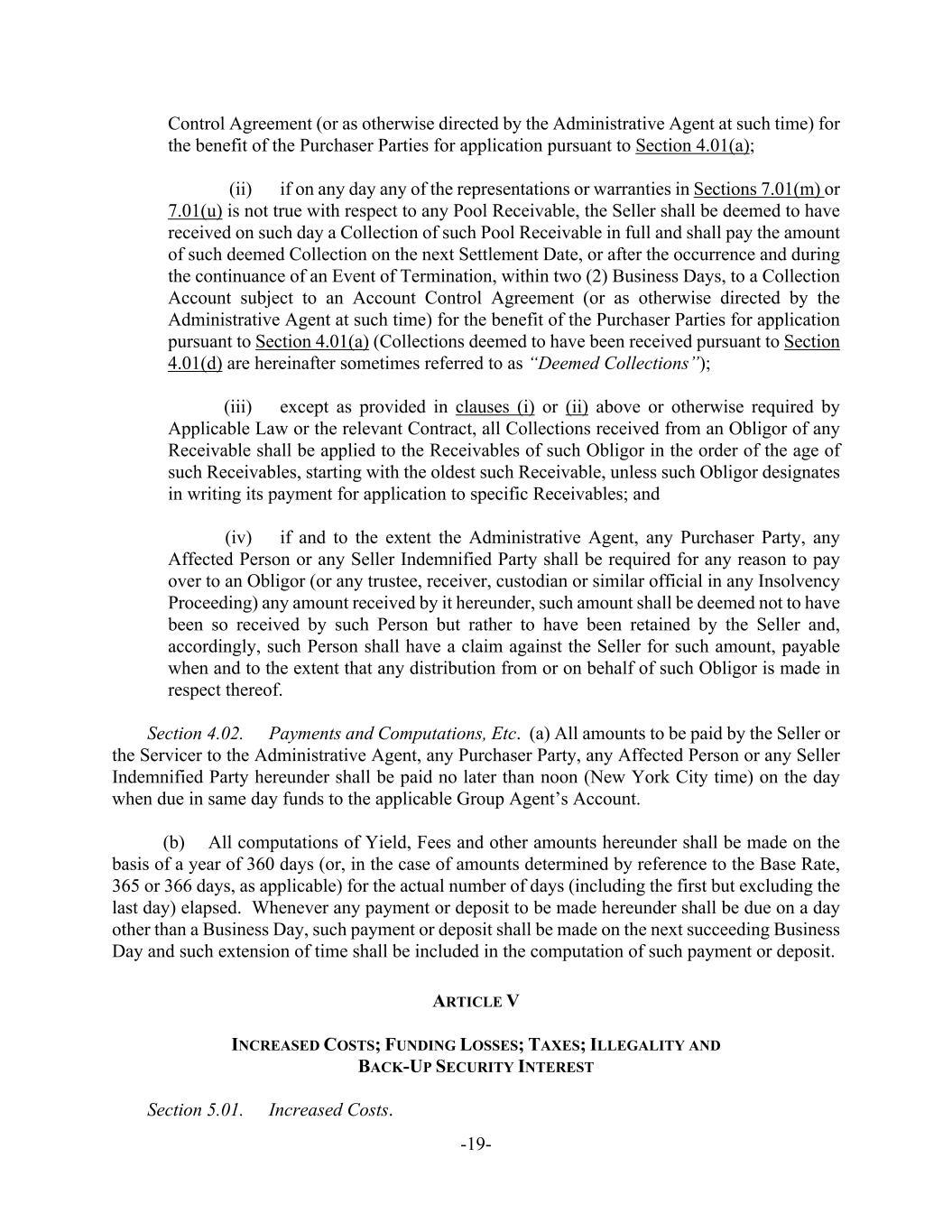 -19- Control Agreement (or as otherwise directed by the Administrative Agent at such time) for the benefit of the Purchaser Parties for application pursuant to Section 4.01(a); (ii) if on any day any of the representations or warranties in Sections 7.01(m) or 7.01(u) is not true with respect to any Pool Receivable, the Seller shall be deemed to have received on such day a Collection of such Pool Receivable in full and shall pay the amount of such deemed Collection on the next Settlement Date, or after the occurrence and during the continuance of an Event of Termination, within two (2) Business Days, to a Collection Account subject to an Account Control Agreement (or as otherwise directed by the Administrative Agent at such time) for the benefit of the Purchaser Parties for application pursuant to Section 4.01(a) (Collections deemed to have been received pursuant to Section 4.01(d) are hereinafter sometimes referred to as “Deemed Collections”); (iii) except as provided in clauses (i) or (ii) above or otherwise required by Applicable Law or the relevant Contract, all Collections received from an Obligor of any Receivable shall be applied to the Receivables of such Obligor in the order of the age of such Receivables, starting with the oldest such Receivable, unless such Obligor designates in writing its payment for application to specific Receivables; and (iv) if and to the extent the Administrative Agent, any Purchaser Party, any Affected Person or any Seller Indemnified Party shall be required for any reason to pay over to an Obligor (or any trustee, receiver, custodian or similar official in any Insolvency Proceeding) any amount received by it hereunder, such amount shall be deemed not to have been so received by such Person but rather to have been retained by the Seller and, accordingly, such Person shall have a claim against the Seller for such amount, payable when and to the extent that any distribution from or on behalf of such Obligor is made in respect thereof. Section 4.02. Payments and Computations, Etc. (a) All amounts to be paid by the Seller or the Servicer to the Administrative Agent, any Purchaser Party, any Affected Person or any Seller Indemnified Party hereunder shall be paid no later than noon (New York City time) on the day when due in same day funds to the applicable Group Agent’s Account. (b) All computations of Yield, Fees and other amounts hereunder shall be made on the basis of a year of 360 days (or, in the case of amounts determined by reference to the Base Rate, 365 or 366 days, as applicable) for the actual number of days (including the first but excluding the last day) elapsed. Whenever any payment or deposit to be made hereunder shall be due on a day other than a Business Day, such payment or deposit shall be made on the next succeeding Business Day and such extension of time shall be included in the computation of such payment or deposit. ARTICLE V INCREASED COSTS; FUNDING LOSSES; TAXES; ILLEGALITY AND BACK-UP SECURITY INTEREST Section 5.01. Increased Costs.
