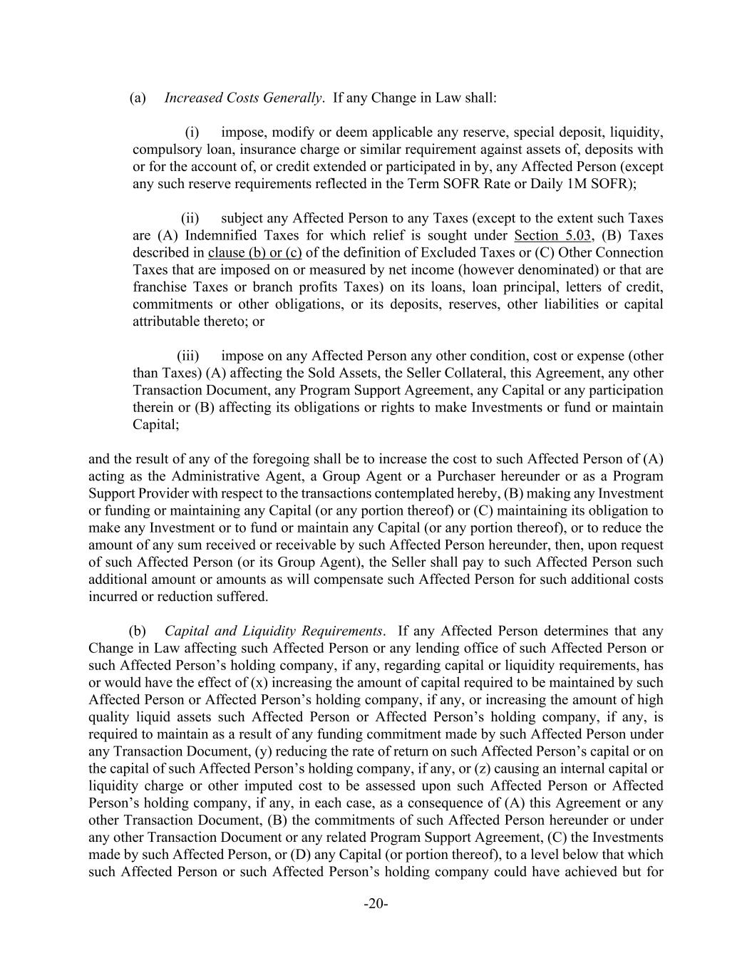 -20- (a) Increased Costs Generally. If any Change in Law shall: (i) impose, modify or deem applicable any reserve, special deposit, liquidity, compulsory loan, insurance charge or similar requirement against assets of, deposits with or for the account of, or credit extended or participated in by, any Affected Person (except any such reserve requirements reflected in the Term SOFR Rate or Daily 1M SOFR); (ii) subject any Affected Person to any Taxes (except to the extent such Taxes are (A) Indemnified Taxes for which relief is sought under Section 5.03, (B) Taxes described in clause (b) or (c) of the definition of Excluded Taxes or (C) Other Connection Taxes that are imposed on or measured by net income (however denominated) or that are franchise Taxes or branch profits Taxes) on its loans, loan principal, letters of credit, commitments or other obligations, or its deposits, reserves, other liabilities or capital attributable thereto; or (iii) impose on any Affected Person any other condition, cost or expense (other than Taxes) (A) affecting the Sold Assets, the Seller Collateral, this Agreement, any other Transaction Document, any Program Support Agreement, any Capital or any participation therein or (B) affecting its obligations or rights to make Investments or fund or maintain Capital; and the result of any of the foregoing shall be to increase the cost to such Affected Person of (A) acting as the Administrative Agent, a Group Agent or a Purchaser hereunder or as a Program Support Provider with respect to the transactions contemplated hereby, (B) making any Investment or funding or maintaining any Capital (or any portion thereof) or (C) maintaining its obligation to make any Investment or to fund or maintain any Capital (or any portion thereof), or to reduce the amount of any sum received or receivable by such Affected Person hereunder, then, upon request of such Affected Person (or its Group Agent), the Seller shall pay to such Affected Person such additional amount or amounts as will compensate such Affected Person for such additional costs incurred or reduction suffered. (b) Capital and Liquidity Requirements. If any Affected Person determines that any Change in Law affecting such Affected Person or any lending office of such Affected Person or such Affected Person’s holding company, if any, regarding capital or liquidity requirements, has or would have the effect of (x) increasing the amount of capital required to be maintained by such Affected Person or Affected Person’s holding company, if any, or increasing the amount of high quality liquid assets such Affected Person or Affected Person’s holding company, if any, is required to maintain as a result of any funding commitment made by such Affected Person under any Transaction Document, (y) reducing the rate of return on such Affected Person’s capital or on the capital of such Affected Person’s holding company, if any, or (z) causing an internal capital or liquidity charge or other imputed cost to be assessed upon such Affected Person or Affected Person’s holding company, if any, in each case, as a consequence of (A) this Agreement or any other Transaction Document, (B) the commitments of such Affected Person hereunder or under any other Transaction Document or any related Program Support Agreement, (C) the Investments made by such Affected Person, or (D) any Capital (or portion thereof), to a level below that which such Affected Person or such Affected Person’s holding company could have achieved but for
