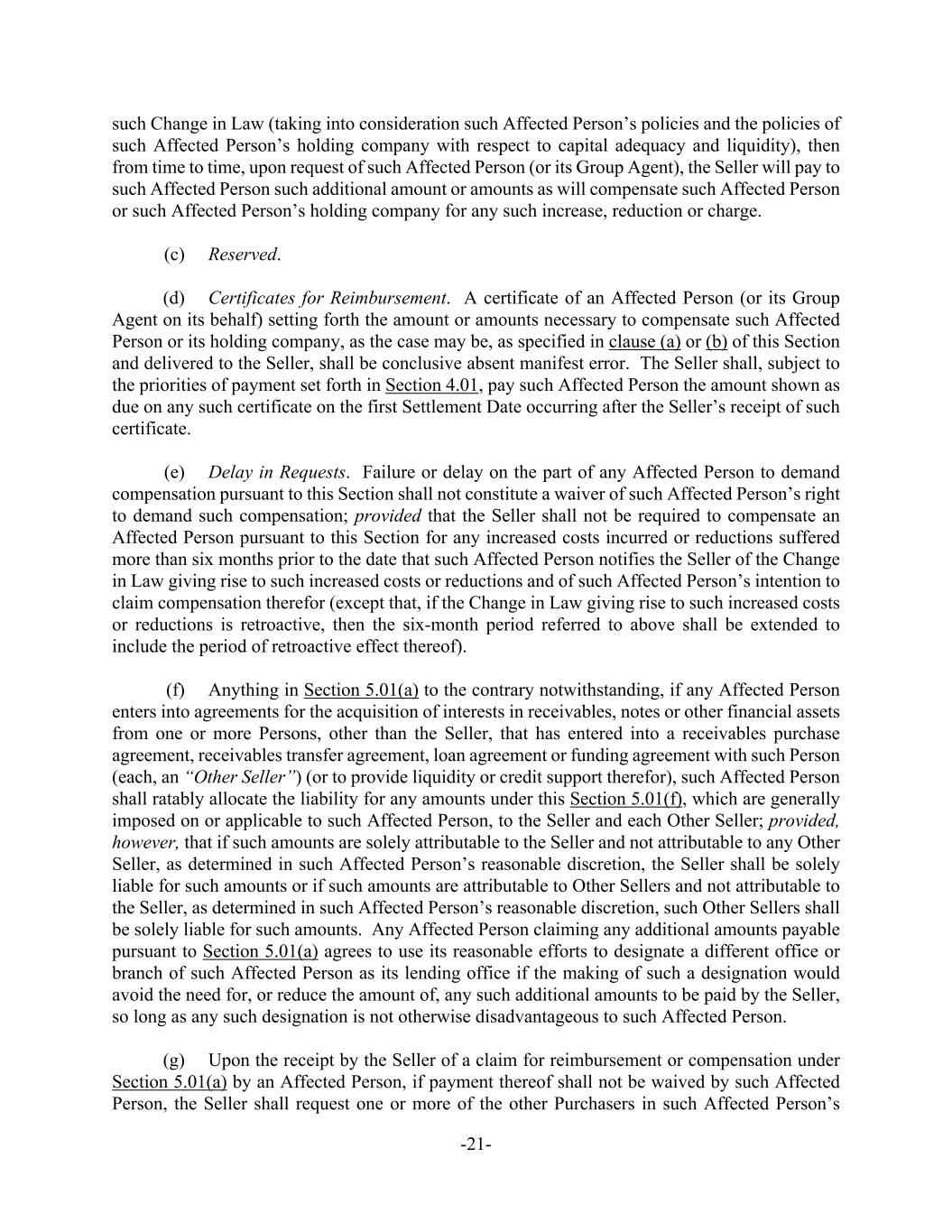 -21- such Change in Law (taking into consideration such Affected Person’s policies and the policies of such Affected Person’s holding company with respect to capital adequacy and liquidity), then from time to time, upon request of such Affected Person (or its Group Agent), the Seller will pay to such Affected Person such additional amount or amounts as will compensate such Affected Person or such Affected Person’s holding company for any such increase, reduction or charge. (c) Reserved. (d) Certificates for Reimbursement. A certificate of an Affected Person (or its Group Agent on its behalf) setting forth the amount or amounts necessary to compensate such Affected Person or its holding company, as the case may be, as specified in clause (a) or (b) of this Section and delivered to the Seller, shall be conclusive absent manifest error. The Seller shall, subject to the priorities of payment set forth in Section 4.01, pay such Affected Person the amount shown as due on any such certificate on the first Settlement Date occurring after the Seller’s receipt of such certificate. (e) Delay in Requests. Failure or delay on the part of any Affected Person to demand compensation pursuant to this Section shall not constitute a waiver of such Affected Person’s right to demand such compensation; provided that the Seller shall not be required to compensate an Affected Person pursuant to this Section for any increased costs incurred or reductions suffered more than six months prior to the date that such Affected Person notifies the Seller of the Change in Law giving rise to such increased costs or reductions and of such Affected Person’s intention to claim compensation therefor (except that, if the Change in Law giving rise to such increased costs or reductions is retroactive, then the six-month period referred to above shall be extended to include the period of retroactive effect thereof). (f) Anything in Section 5.01(a) to the contrary notwithstanding, if any Affected Person enters into agreements for the acquisition of interests in receivables, notes or other financial assets from one or more Persons, other than the Seller, that has entered into a receivables purchase agreement, receivables transfer agreement, loan agreement or funding agreement with such Person (each, an “Other Seller”) (or to provide liquidity or credit support therefor), such Affected Person shall ratably allocate the liability for any amounts under this Section 5.01(f), which are generally imposed on or applicable to such Affected Person, to the Seller and each Other Seller; provided, however, that if such amounts are solely attributable to the Seller and not attributable to any Other Seller, as determined in such Affected Person’s reasonable discretion, the Seller shall be solely liable for such amounts or if such amounts are attributable to Other Sellers and not attributable to the Seller, as determined in such Affected Person’s reasonable discretion, such Other Sellers shall be solely liable for such amounts. Any Affected Person claiming any additional amounts payable pursuant to Section 5.01(a) agrees to use its reasonable efforts to designate a different office or branch of such Affected Person as its lending office if the making of such a designation would avoid the need for, or reduce the amount of, any such additional amounts to be paid by the Seller, so long as any such designation is not otherwise disadvantageous to such Affected Person. (g) Upon the receipt by the Seller of a claim for reimbursement or compensation under Section 5.01(a) by an Affected Person, if payment thereof shall not be waived by such Affected Person, the Seller shall request one or more of the other Purchasers in such Affected Person’s