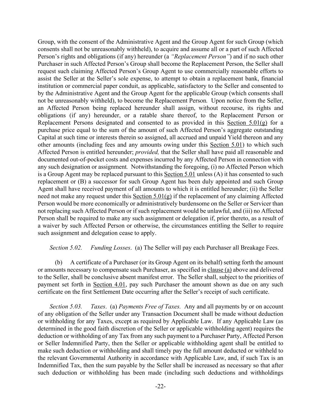 -22- Group, with the consent of the Administrative Agent and the Group Agent for such Group (which consents shall not be unreasonably withheld), to acquire and assume all or a part of such Affected Person’s rights and obligations (if any) hereunder (a “Replacement Person”) and if no such other Purchaser in such Affected Person’s Group shall become the Replacement Person, the Seller shall request such claiming Affected Person’s Group Agent to use commercially reasonable efforts to assist the Seller at the Seller’s sole expense, to attempt to obtain a replacement bank, financial institution or commercial paper conduit, as applicable, satisfactory to the Seller and consented to by the Administrative Agent and the Group Agent for the applicable Group (which consents shall not be unreasonably withheld), to become the Replacement Person. Upon notice from the Seller, an Affected Person being replaced hereunder shall assign, without recourse, its rights and obligations (if any) hereunder, or a ratable share thereof, to the Replacement Person or Replacement Persons designated and consented to as provided in this Section 5.01(g) for a purchase price equal to the sum of the amount of such Affected Person’s aggregate outstanding Capital at such time or interests therein so assigned, all accrued and unpaid Yield thereon and any other amounts (including fees and any amounts owing under this Section 5.01) to which such Affected Person is entitled hereunder; provided, that the Seller shall have paid all reasonable and documented out-of-pocket costs and expenses incurred by any Affected Person in connection with any such designation or assignment. Notwithstanding the foregoing, (i) no Affected Person which is a Group Agent may be replaced pursuant to this Section 5.01 unless (A) it has consented to such replacement or (B) a successor for such Group Agent has been duly appointed and such Group Agent shall have received payment of all amounts to which it is entitled hereunder; (ii) the Seller need not make any request under this Section 5.01(g) if the replacement of any claiming Affected Person would be more economically or administratively burdensome on the Seller or Servicer than not replacing such Affected Person or if such replacement would be unlawful, and (iii) no Affected Person shall be required to make any such assignment or delegation if, prior thereto, as a result of a waiver by such Affected Person or otherwise, the circumstances entitling the Seller to require such assignment and delegation cease to apply. Section 5.02. Funding Losses. (a) The Seller will pay each Purchaser all Breakage Fees. (b) A certificate of a Purchaser (or its Group Agent on its behalf) setting forth the amount or amounts necessary to compensate such Purchaser, as specified in clause (a) above and delivered to the Seller, shall be conclusive absent manifest error. The Seller shall, subject to the priorities of payment set forth in Section 4.01, pay such Purchaser the amount shown as due on any such certificate on the first Settlement Date occurring after the Seller’s receipt of such certificate. Section 5.03. Taxes. (a) Payments Free of Taxes. Any and all payments by or on account of any obligation of the Seller under any Transaction Document shall be made without deduction or withholding for any Taxes, except as required by Applicable Law. If any Applicable Law (as determined in the good faith discretion of the Seller or applicable withholding agent) requires the deduction or withholding of any Tax from any such payment to a Purchaser Party, Affected Person or Seller Indemnified Party, then the Seller or applicable withholding agent shall be entitled to make such deduction or withholding and shall timely pay the full amount deducted or withheld to the relevant Governmental Authority in accordance with Applicable Law, and, if such Tax is an Indemnified Tax, then the sum payable by the Seller shall be increased as necessary so that after such deduction or withholding has been made (including such deductions and withholdings