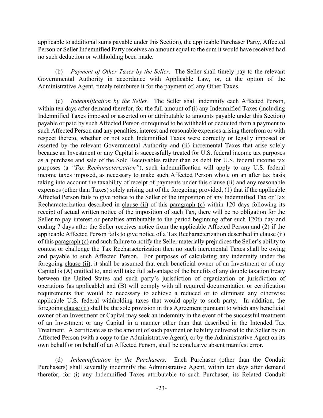 -23- applicable to additional sums payable under this Section), the applicable Purchaser Party, Affected Person or Seller Indemnified Party receives an amount equal to the sum it would have received had no such deduction or withholding been made. (b) Payment of Other Taxes by the Seller. The Seller shall timely pay to the relevant Governmental Authority in accordance with Applicable Law, or, at the option of the Administrative Agent, timely reimburse it for the payment of, any Other Taxes. (c) Indemnification by the Seller. The Seller shall indemnify each Affected Person, within ten days after demand therefor, for the full amount of (i) any Indemnified Taxes (including Indemnified Taxes imposed or asserted on or attributable to amounts payable under this Section) payable or paid by such Affected Person or required to be withheld or deducted from a payment to such Affected Person and any penalties, interest and reasonable expenses arising therefrom or with respect thereto, whether or not such Indemnified Taxes were correctly or legally imposed or asserted by the relevant Governmental Authority and (ii) incremental Taxes that arise solely because an Investment or any Capital is successfully treated for U.S. federal income tax purposes as a purchase and sale of the Sold Receivables rather than as debt for U.S. federal income tax purposes (a “Tax Recharacterization”), such indemnification will apply to any U.S. federal income taxes imposed, as necessary to make such Affected Person whole on an after tax basis taking into account the taxability of receipt of payments under this clause (ii) and any reasonable expenses (other than Taxes) solely arising out of the foregoing; provided, (1) that if the applicable Affected Person fails to give notice to the Seller of the imposition of any Indemnified Tax or Tax Recharacterization described in clause (ii) of this paragraph (c) within 120 days following its receipt of actual written notice of the imposition of such Tax, there will be no obligation for the Seller to pay interest or penalties attributable to the period beginning after such 120th day and ending 7 days after the Seller receives notice from the applicable Affected Person and (2) if the applicable Affected Person fails to give notice of a Tax Recharacterization described in clause (ii) of this paragraph (c) and such failure to notify the Seller materially prejudices the Seller’s ability to contest or challenge the Tax Recharacterization then no such incremental Taxes shall be owing and payable to such Affected Person. For purposes of calculating any indemnity under the foregoing clause (ii), it shall be assumed that each beneficial owner of an Investment or of any Capital is (A) entitled to, and will take full advantage of the benefits of any double taxation treaty between the United States and such party’s jurisdiction of organization or jurisdiction of operations (as applicable) and (B) will comply with all required documentation or certification requirements that would be necessary to achieve a reduced or to eliminate any otherwise applicable U.S. federal withholding taxes that would apply to such party. In addition, the foregoing clause (ii) shall be the sole provision in this Agreement pursuant to which any beneficial owner of an Investment or Capital may seek an indemnity in the event of the successful treatment of an Investment or any Capital in a manner other than that described in the Intended Tax Treatment. A certificate as to the amount of such payment or liability delivered to the Seller by an Affected Person (with a copy to the Administrative Agent), or by the Administrative Agent on its own behalf or on behalf of an Affected Person, shall be conclusive absent manifest error. (d) Indemnification by the Purchasers. Each Purchaser (other than the Conduit Purchasers) shall severally indemnify the Administrative Agent, within ten days after demand therefor, for (i) any Indemnified Taxes attributable to such Purchaser, its Related Conduit