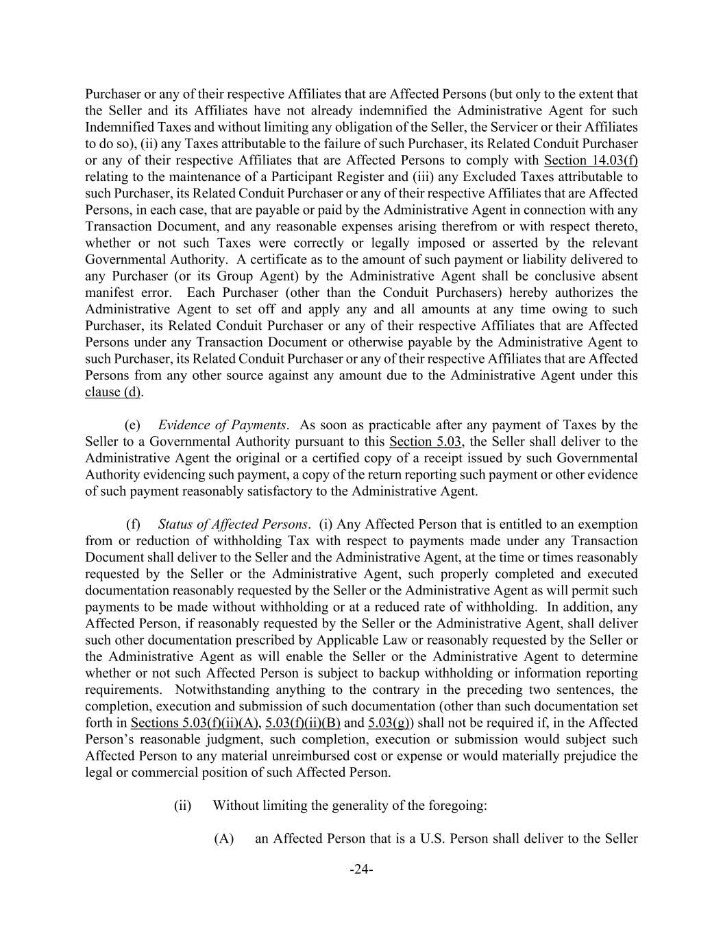 -24- Purchaser or any of their respective Affiliates that are Affected Persons (but only to the extent that the Seller and its Affiliates have not already indemnified the Administrative Agent for such Indemnified Taxes and without limiting any obligation of the Seller, the Servicer or their Affiliates to do so), (ii) any Taxes attributable to the failure of such Purchaser, its Related Conduit Purchaser or any of their respective Affiliates that are Affected Persons to comply with Section 14.03(f) relating to the maintenance of a Participant Register and (iii) any Excluded Taxes attributable to such Purchaser, its Related Conduit Purchaser or any of their respective Affiliates that are Affected Persons, in each case, that are payable or paid by the Administrative Agent in connection with any Transaction Document, and any reasonable expenses arising therefrom or with respect thereto, whether or not such Taxes were correctly or legally imposed or asserted by the relevant Governmental Authority. A certificate as to the amount of such payment or liability delivered to any Purchaser (or its Group Agent) by the Administrative Agent shall be conclusive absent manifest error. Each Purchaser (other than the Conduit Purchasers) hereby authorizes the Administrative Agent to set off and apply any and all amounts at any time owing to such Purchaser, its Related Conduit Purchaser or any of their respective Affiliates that are Affected Persons under any Transaction Document or otherwise payable by the Administrative Agent to such Purchaser, its Related Conduit Purchaser or any of their respective Affiliates that are Affected Persons from any other source against any amount due to the Administrative Agent under this clause (d). (e) Evidence of Payments. As soon as practicable after any payment of Taxes by the Seller to a Governmental Authority pursuant to this Section 5.03, the Seller shall deliver to the Administrative Agent the original or a certified copy of a receipt issued by such Governmental Authority evidencing such payment, a copy of the return reporting such payment or other evidence of such payment reasonably satisfactory to the Administrative Agent. (f) Status of Affected Persons. (i) Any Affected Person that is entitled to an exemption from or reduction of withholding Tax with respect to payments made under any Transaction Document shall deliver to the Seller and the Administrative Agent, at the time or times reasonably requested by the Seller or the Administrative Agent, such properly completed and executed documentation reasonably requested by the Seller or the Administrative Agent as will permit such payments to be made without withholding or at a reduced rate of withholding. In addition, any Affected Person, if reasonably requested by the Seller or the Administrative Agent, shall deliver such other documentation prescribed by Applicable Law or reasonably requested by the Seller or the Administrative Agent as will enable the Seller or the Administrative Agent to determine whether or not such Affected Person is subject to backup withholding or information reporting requirements. Notwithstanding anything to the contrary in the preceding two sentences, the completion, execution and submission of such documentation (other than such documentation set forth in Sections 5.03(f)(ii)(A), 5.03(f)(ii)(B) and 5.03(g)) shall not be required if, in the Affected Person’s reasonable judgment, such completion, execution or submission would subject such Affected Person to any material unreimbursed cost or expense or would materially prejudice the legal or commercial position of such Affected Person. (ii) Without limiting the generality of the foregoing: (A) an Affected Person that is a U.S. Person shall deliver to the Seller