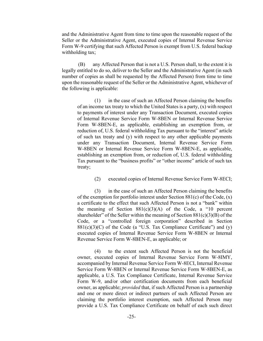 -25- and the Administrative Agent from time to time upon the reasonable request of the Seller or the Administrative Agent, executed copies of Internal Revenue Service Form W-9 certifying that such Affected Person is exempt from U.S. federal backup withholding tax; (B) any Affected Person that is not a U.S. Person shall, to the extent it is legally entitled to do so, deliver to the Seller and the Administrative Agent (in such number of copies as shall be requested by the Affected Person) from time to time upon the reasonable request of the Seller or the Administrative Agent, whichever of the following is applicable: (1) in the case of such an Affected Person claiming the benefits of an income tax treaty to which the United States is a party, (x) with respect to payments of interest under any Transaction Document, executed copies of Internal Revenue Service Form W-8BEN or Internal Revenue Service Form W-8BEN-E, as applicable, establishing an exemption from, or reduction of, U.S. federal withholding Tax pursuant to the “interest” article of such tax treaty and (y) with respect to any other applicable payments under any Transaction Document, Internal Revenue Service Form W-8BEN or Internal Revenue Service Form W-8BEN-E, as applicable, establishing an exemption from, or reduction of, U.S. federal withholding Tax pursuant to the “business profits” or “other income” article of such tax treaty; (2) executed copies of Internal Revenue Service Form W-8ECI; (3) in the case of such an Affected Person claiming the benefits of the exemption for portfolio interest under Section 881(c) of the Code, (x) a certificate to the effect that such Affected Person is not a “bank” within the meaning of Section 881(c)(3)(A) of the Code, a “10 percent shareholder” of the Seller within the meaning of Section 881(c)(3)(B) of the Code, or a “controlled foreign corporation” described in Section 881(c)(3)(C) of the Code (a “U.S. Tax Compliance Certificate”) and (y) executed copies of Internal Revenue Service Form W-8BEN or Internal Revenue Service Form W-8BEN-E, as applicable; or (4) to the extent such Affected Person is not the beneficial owner, executed copies of Internal Revenue Service Form W-8IMY, accompanied by Internal Revenue Service Form W-8ECI, Internal Revenue Service Form W-8BEN or Internal Revenue Service Form W-8BEN-E, as applicable, a U.S. Tax Compliance Certificate, Internal Revenue Service Form W-9, and/or other certification documents from each beneficial owner, as applicable; provided that, if such Affected Person is a partnership and one or more direct or indirect partners of such Affected Person are claiming the portfolio interest exemption, such Affected Person may provide a U.S. Tax Compliance Certificate on behalf of each such direct