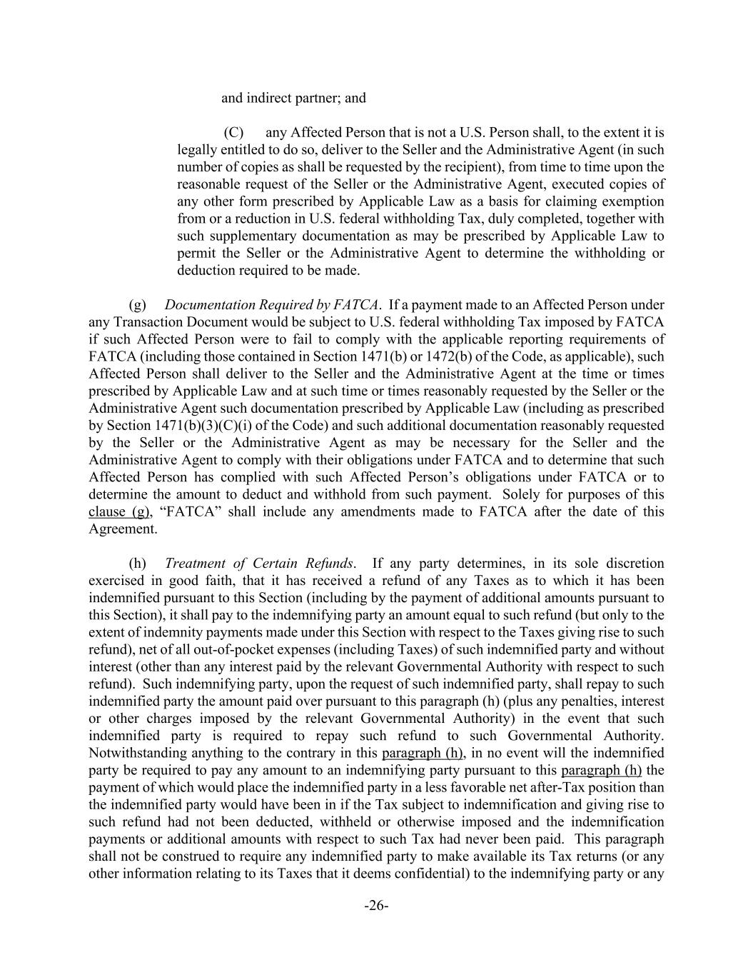 -26- and indirect partner; and (C) any Affected Person that is not a U.S. Person shall, to the extent it is legally entitled to do so, deliver to the Seller and the Administrative Agent (in such number of copies as shall be requested by the recipient), from time to time upon the reasonable request of the Seller or the Administrative Agent, executed copies of any other form prescribed by Applicable Law as a basis for claiming exemption from or a reduction in U.S. federal withholding Tax, duly completed, together with such supplementary documentation as may be prescribed by Applicable Law to permit the Seller or the Administrative Agent to determine the withholding or deduction required to be made. (g) Documentation Required by FATCA. If a payment made to an Affected Person under any Transaction Document would be subject to U.S. federal withholding Tax imposed by FATCA if such Affected Person were to fail to comply with the applicable reporting requirements of FATCA (including those contained in Section 1471(b) or 1472(b) of the Code, as applicable), such Affected Person shall deliver to the Seller and the Administrative Agent at the time or times prescribed by Applicable Law and at such time or times reasonably requested by the Seller or the Administrative Agent such documentation prescribed by Applicable Law (including as prescribed by Section 1471(b)(3)(C)(i) of the Code) and such additional documentation reasonably requested by the Seller or the Administrative Agent as may be necessary for the Seller and the Administrative Agent to comply with their obligations under FATCA and to determine that such Affected Person has complied with such Affected Person’s obligations under FATCA or to determine the amount to deduct and withhold from such payment. Solely for purposes of this clause (g), “FATCA” shall include any amendments made to FATCA after the date of this Agreement. (h) Treatment of Certain Refunds. If any party determines, in its sole discretion exercised in good faith, that it has received a refund of any Taxes as to which it has been indemnified pursuant to this Section (including by the payment of additional amounts pursuant to this Section), it shall pay to the indemnifying party an amount equal to such refund (but only to the extent of indemnity payments made under this Section with respect to the Taxes giving rise to such refund), net of all out-of-pocket expenses (including Taxes) of such indemnified party and without interest (other than any interest paid by the relevant Governmental Authority with respect to such refund). Such indemnifying party, upon the request of such indemnified party, shall repay to such indemnified party the amount paid over pursuant to this paragraph (h) (plus any penalties, interest or other charges imposed by the relevant Governmental Authority) in the event that such indemnified party is required to repay such refund to such Governmental Authority. Notwithstanding anything to the contrary in this paragraph (h), in no event will the indemnified party be required to pay any amount to an indemnifying party pursuant to this paragraph (h) the payment of which would place the indemnified party in a less favorable net after-Tax position than the indemnified party would have been in if the Tax subject to indemnification and giving rise to such refund had not been deducted, withheld or otherwise imposed and the indemnification payments or additional amounts with respect to such Tax had never been paid. This paragraph shall not be construed to require any indemnified party to make available its Tax returns (or any other information relating to its Taxes that it deems confidential) to the indemnifying party or any