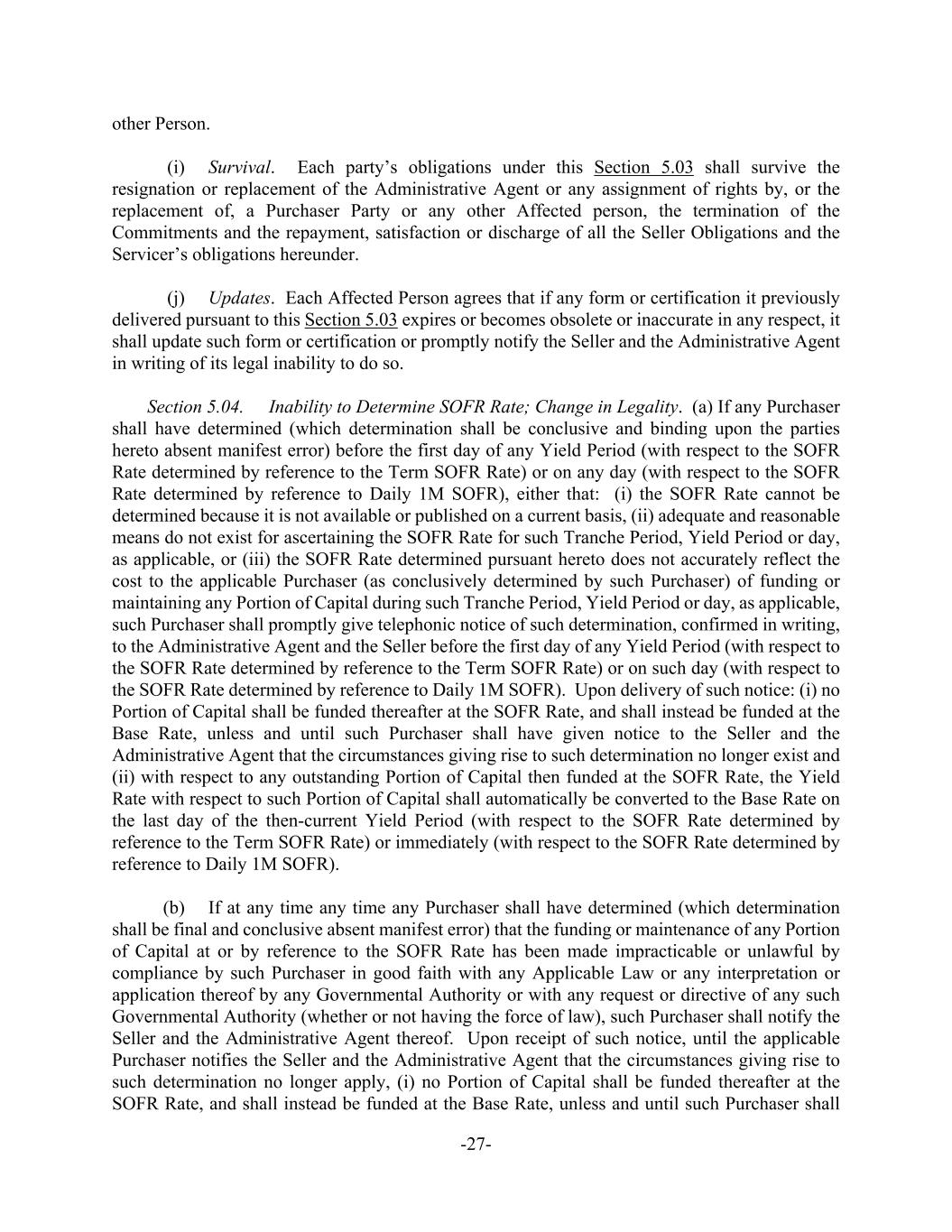 -27- other Person. (i) Survival. Each party’s obligations under this Section 5.03 shall survive the resignation or replacement of the Administrative Agent or any assignment of rights by, or the replacement of, a Purchaser Party or any other Affected person, the termination of the Commitments and the repayment, satisfaction or discharge of all the Seller Obligations and the Servicer’s obligations hereunder. (j) Updates. Each Affected Person agrees that if any form or certification it previously delivered pursuant to this Section 5.03 expires or becomes obsolete or inaccurate in any respect, it shall update such form or certification or promptly notify the Seller and the Administrative Agent in writing of its legal inability to do so. Section 5.04. Inability to Determine SOFR Rate; Change in Legality. (a) If any Purchaser shall have determined (which determination shall be conclusive and binding upon the parties hereto absent manifest error) before the first day of any Yield Period (with respect to the SOFR Rate determined by reference to the Term SOFR Rate) or on any day (with respect to the SOFR Rate determined by reference to Daily 1M SOFR), either that: (i) the SOFR Rate cannot be determined because it is not available or published on a current basis, (ii) adequate and reasonable means do not exist for ascertaining the SOFR Rate for such Tranche Period, Yield Period or day, as applicable, or (iii) the SOFR Rate determined pursuant hereto does not accurately reflect the cost to the applicable Purchaser (as conclusively determined by such Purchaser) of funding or maintaining any Portion of Capital during such Tranche Period, Yield Period or day, as applicable, such Purchaser shall promptly give telephonic notice of such determination, confirmed in writing, to the Administrative Agent and the Seller before the first day of any Yield Period (with respect to the SOFR Rate determined by reference to the Term SOFR Rate) or on such day (with respect to the SOFR Rate determined by reference to Daily 1M SOFR). Upon delivery of such notice: (i) no Portion of Capital shall be funded thereafter at the SOFR Rate, and shall instead be funded at the Base Rate, unless and until such Purchaser shall have given notice to the Seller and the Administrative Agent that the circumstances giving rise to such determination no longer exist and (ii) with respect to any outstanding Portion of Capital then funded at the SOFR Rate, the Yield Rate with respect to such Portion of Capital shall automatically be converted to the Base Rate on the last day of the then-current Yield Period (with respect to the SOFR Rate determined by reference to the Term SOFR Rate) or immediately (with respect to the SOFR Rate determined by reference to Daily 1M SOFR). (b) If at any time any time any Purchaser shall have determined (which determination shall be final and conclusive absent manifest error) that the funding or maintenance of any Portion of Capital at or by reference to the SOFR Rate has been made impracticable or unlawful by compliance by such Purchaser in good faith with any Applicable Law or any interpretation or application thereof by any Governmental Authority or with any request or directive of any such Governmental Authority (whether or not having the force of law), such Purchaser shall notify the Seller and the Administrative Agent thereof. Upon receipt of such notice, until the applicable Purchaser notifies the Seller and the Administrative Agent that the circumstances giving rise to such determination no longer apply, (i) no Portion of Capital shall be funded thereafter at the SOFR Rate, and shall instead be funded at the Base Rate, unless and until such Purchaser shall