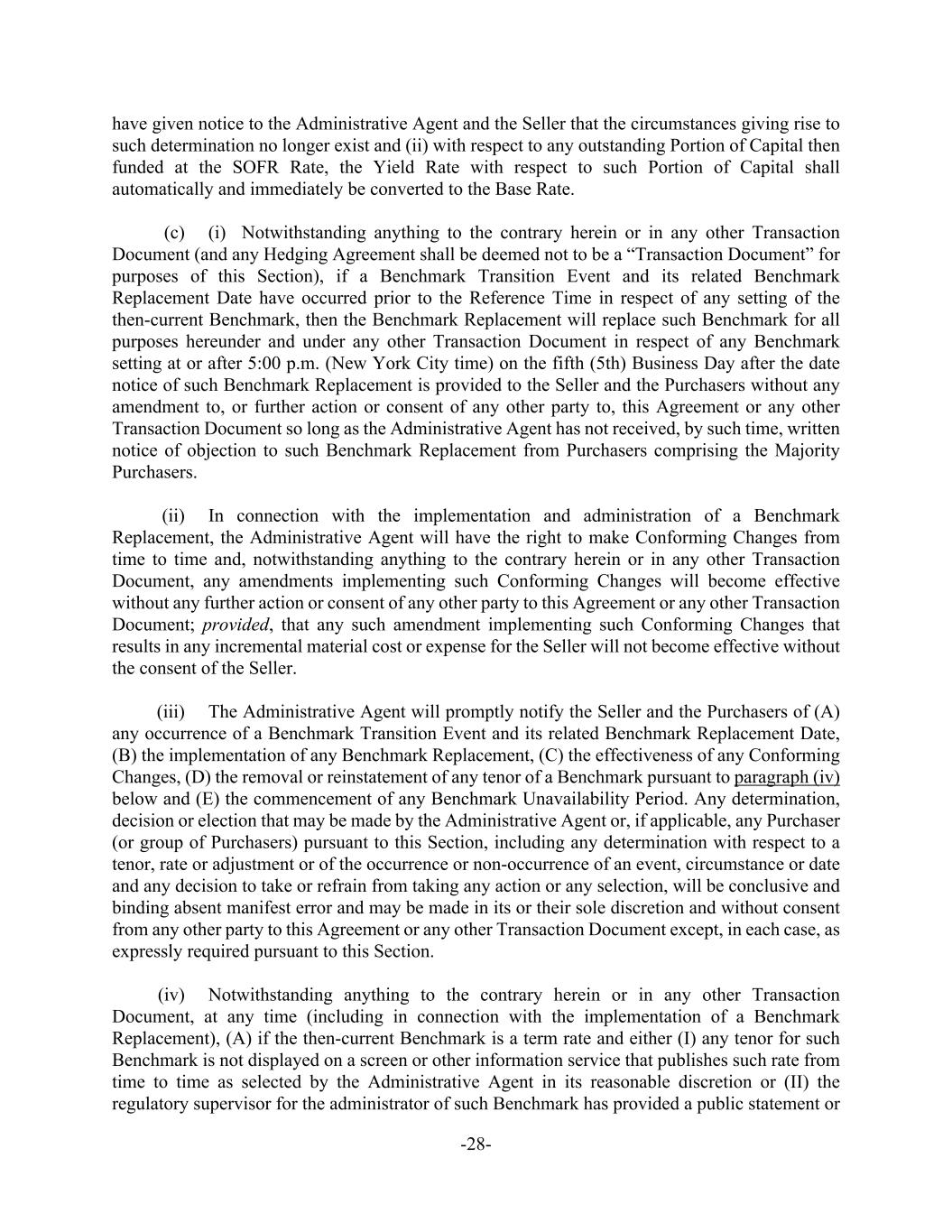 -28- have given notice to the Administrative Agent and the Seller that the circumstances giving rise to such determination no longer exist and (ii) with respect to any outstanding Portion of Capital then funded at the SOFR Rate, the Yield Rate with respect to such Portion of Capital shall automatically and immediately be converted to the Base Rate. (c) (i) Notwithstanding anything to the contrary herein or in any other Transaction Document (and any Hedging Agreement shall be deemed not to be a “Transaction Document” for purposes of this Section), if a Benchmark Transition Event and its related Benchmark Replacement Date have occurred prior to the Reference Time in respect of any setting of the then-current Benchmark, then the Benchmark Replacement will replace such Benchmark for all purposes hereunder and under any other Transaction Document in respect of any Benchmark setting at or after 5:00 p.m. (New York City time) on the fifth (5th) Business Day after the date notice of such Benchmark Replacement is provided to the Seller and the Purchasers without any amendment to, or further action or consent of any other party to, this Agreement or any other Transaction Document so long as the Administrative Agent has not received, by such time, written notice of objection to such Benchmark Replacement from Purchasers comprising the Majority Purchasers. (ii) In connection with the implementation and administration of a Benchmark Replacement, the Administrative Agent will have the right to make Conforming Changes from time to time and, notwithstanding anything to the contrary herein or in any other Transaction Document, any amendments implementing such Conforming Changes will become effective without any further action or consent of any other party to this Agreement or any other Transaction Document; provided, that any such amendment implementing such Conforming Changes that results in any incremental material cost or expense for the Seller will not become effective without the consent of the Seller. (iii) The Administrative Agent will promptly notify the Seller and the Purchasers of (A) any occurrence of a Benchmark Transition Event and its related Benchmark Replacement Date, (B) the implementation of any Benchmark Replacement, (C) the effectiveness of any Conforming Changes, (D) the removal or reinstatement of any tenor of a Benchmark pursuant to paragraph (iv) below and (E) the commencement of any Benchmark Unavailability Period. Any determination, decision or election that may be made by the Administrative Agent or, if applicable, any Purchaser (or group of Purchasers) pursuant to this Section, including any determination with respect to a tenor, rate or adjustment or of the occurrence or non-occurrence of an event, circumstance or date and any decision to take or refrain from taking any action or any selection, will be conclusive and binding absent manifest error and may be made in its or their sole discretion and without consent from any other party to this Agreement or any other Transaction Document except, in each case, as expressly required pursuant to this Section. (iv) Notwithstanding anything to the contrary herein or in any other Transaction Document, at any time (including in connection with the implementation of a Benchmark Replacement), (A) if the then-current Benchmark is a term rate and either (I) any tenor for such Benchmark is not displayed on a screen or other information service that publishes such rate from time to time as selected by the Administrative Agent in its reasonable discretion or (II) the regulatory supervisor for the administrator of such Benchmark has provided a public statement or