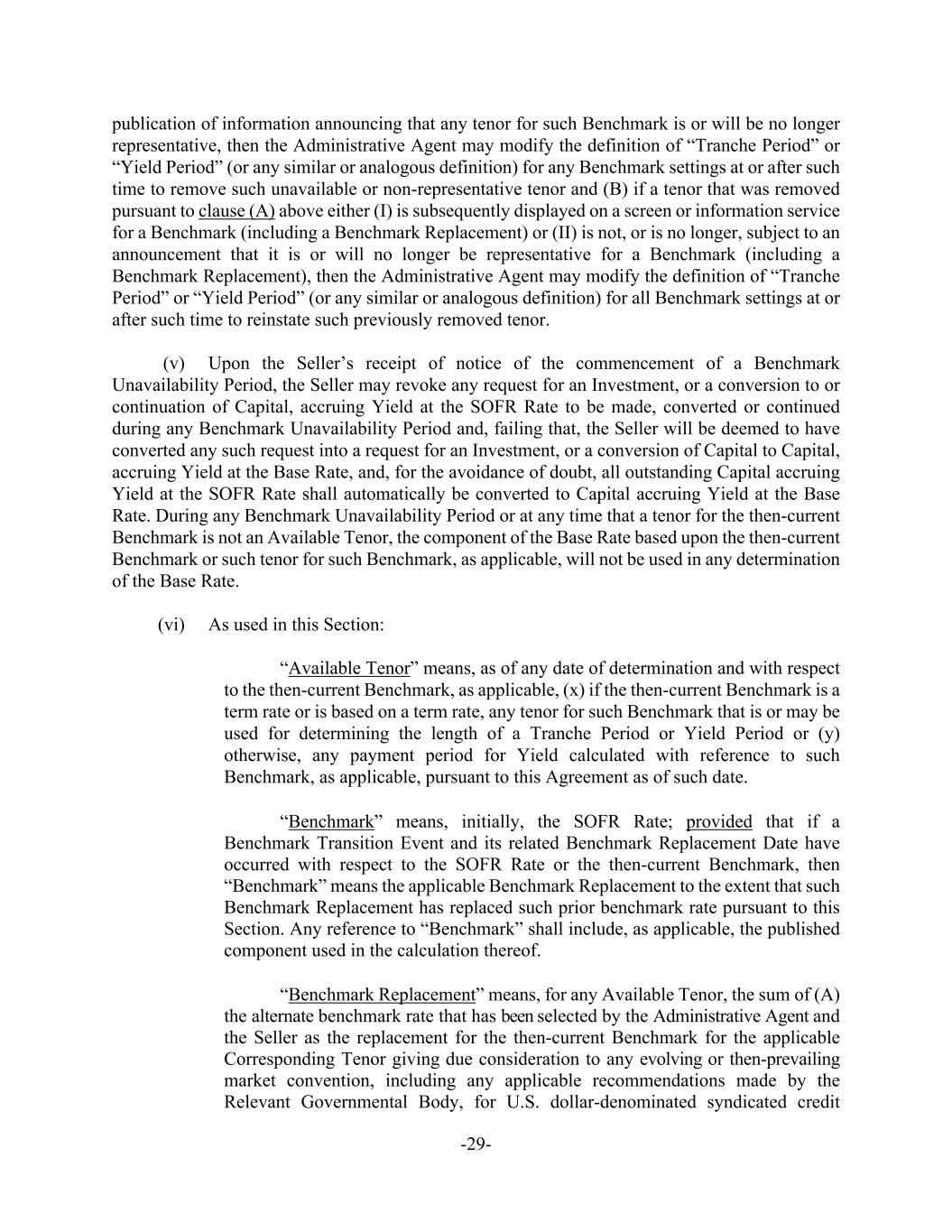 -29- publication of information announcing that any tenor for such Benchmark is or will be no longer representative, then the Administrative Agent may modify the definition of “Tranche Period” or “Yield Period” (or any similar or analogous definition) for any Benchmark settings at or after such time to remove such unavailable or non-representative tenor and (B) if a tenor that was removed pursuant to clause (A) above either (I) is subsequently displayed on a screen or information service for a Benchmark (including a Benchmark Replacement) or (II) is not, or is no longer, subject to an announcement that it is or will no longer be representative for a Benchmark (including a Benchmark Replacement), then the Administrative Agent may modify the definition of “Tranche Period” or “Yield Period” (or any similar or analogous definition) for all Benchmark settings at or after such time to reinstate such previously removed tenor. (v) Upon the Seller’s receipt of notice of the commencement of a Benchmark Unavailability Period, the Seller may revoke any request for an Investment, or a conversion to or continuation of Capital, accruing Yield at the SOFR Rate to be made, converted or continued during any Benchmark Unavailability Period and, failing that, the Seller will be deemed to have converted any such request into a request for an Investment, or a conversion of Capital to Capital, accruing Yield at the Base Rate, and, for the avoidance of doubt, all outstanding Capital accruing Yield at the SOFR Rate shall automatically be converted to Capital accruing Yield at the Base Rate. During any Benchmark Unavailability Period or at any time that a tenor for the then-current Benchmark is not an Available Tenor, the component of the Base Rate based upon the then-current Benchmark or such tenor for such Benchmark, as applicable, will not be used in any determination of the Base Rate. (vi) As used in this Section: “Available Tenor” means, as of any date of determination and with respect to the then-current Benchmark, as applicable, (x) if the then-current Benchmark is a term rate or is based on a term rate, any tenor for such Benchmark that is or may be used for determining the length of a Tranche Period or Yield Period or (y) otherwise, any payment period for Yield calculated with reference to such Benchmark, as applicable, pursuant to this Agreement as of such date. “Benchmark” means, initially, the SOFR Rate; provided that if a Benchmark Transition Event and its related Benchmark Replacement Date have occurred with respect to the SOFR Rate or the then-current Benchmark, then “Benchmark” means the applicable Benchmark Replacement to the extent that such Benchmark Replacement has replaced such prior benchmark rate pursuant to this Section. Any reference to “Benchmark” shall include, as applicable, the published component used in the calculation thereof. “Benchmark Replacement” means, for any Available Tenor, the sum of (A) the alternate benchmark rate that has been selected by the Administrative Agent and the Seller as the replacement for the then-current Benchmark for the applicable Corresponding Tenor giving due consideration to any evolving or then-prevailing market convention, including any applicable recommendations made by the Relevant Governmental Body, for U.S. dollar-denominated syndicated credit