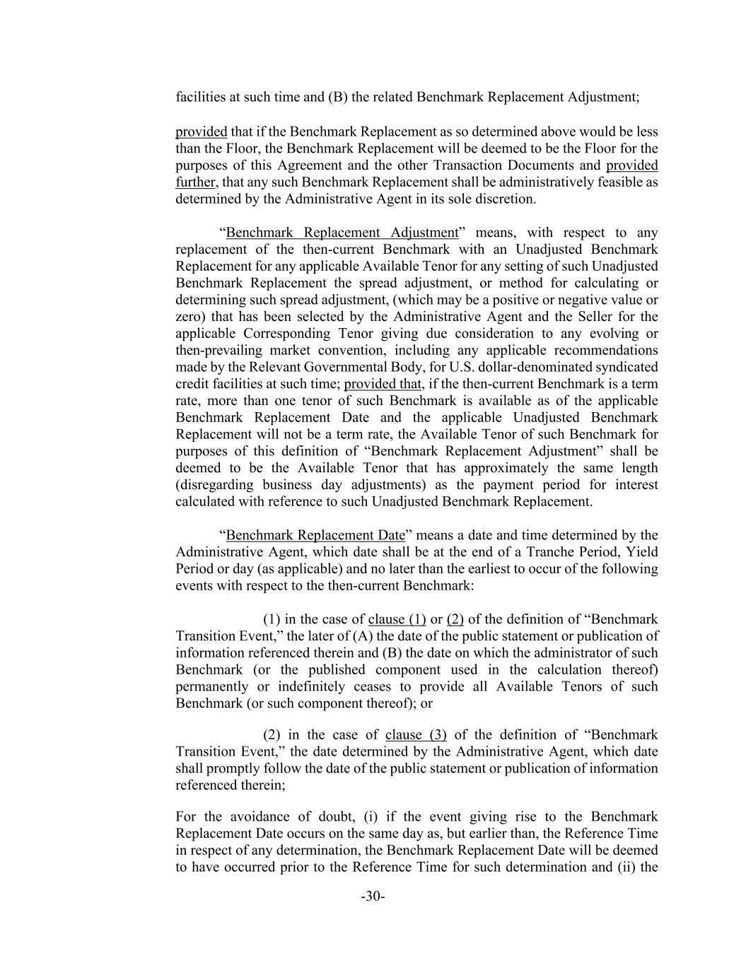 -30- facilities at such time and (B) the related Benchmark Replacement Adjustment; provided that if the Benchmark Replacement as so determined above would be less than the Floor, the Benchmark Replacement will be deemed to be the Floor for the purposes of this Agreement and the other Transaction Documents and provided further, that any such Benchmark Replacement shall be administratively feasible as determined by the Administrative Agent in its sole discretion. “Benchmark Replacement Adjustment” means, with respect to any replacement of the then-current Benchmark with an Unadjusted Benchmark Replacement for any applicable Available Tenor for any setting of such Unadjusted Benchmark Replacement the spread adjustment, or method for calculating or determining such spread adjustment, (which may be a positive or negative value or zero) that has been selected by the Administrative Agent and the Seller for the applicable Corresponding Tenor giving due consideration to any evolving or then-prevailing market convention, including any applicable recommendations made by the Relevant Governmental Body, for U.S. dollar-denominated syndicated credit facilities at such time; provided that, if the then-current Benchmark is a term rate, more than one tenor of such Benchmark is available as of the applicable Benchmark Replacement Date and the applicable Unadjusted Benchmark Replacement will not be a term rate, the Available Tenor of such Benchmark for purposes of this definition of “Benchmark Replacement Adjustment” shall be deemed to be the Available Tenor that has approximately the same length (disregarding business day adjustments) as the payment period for interest calculated with reference to such Unadjusted Benchmark Replacement. “Benchmark Replacement Date” means a date and time determined by the Administrative Agent, which date shall be at the end of a Tranche Period, Yield Period or day (as applicable) and no later than the earliest to occur of the following events with respect to the then-current Benchmark: (1) in the case of clause (1) or (2) of the definition of “Benchmark Transition Event,” the later of (A) the date of the public statement or publication of information referenced therein and (B) the date on which the administrator of such Benchmark (or the published component used in the calculation thereof) permanently or indefinitely ceases to provide all Available Tenors of such Benchmark (or such component thereof); or (2) in the case of clause (3) of the definition of “Benchmark Transition Event,” the date determined by the Administrative Agent, which date shall promptly follow the date of the public statement or publication of information referenced therein; For the avoidance of doubt, (i) if the event giving rise to the Benchmark Replacement Date occurs on the same day as, but earlier than, the Reference Time in respect of any determination, the Benchmark Replacement Date will be deemed to have occurred prior to the Reference Time for such determination and (ii) the