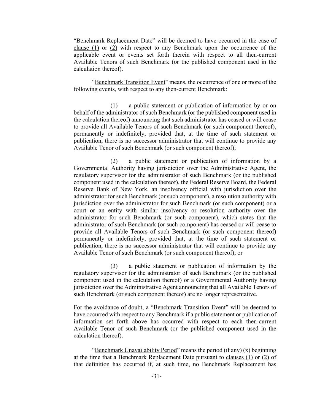 -31- “Benchmark Replacement Date” will be deemed to have occurred in the case of clause (1) or (2) with respect to any Benchmark upon the occurrence of the applicable event or events set forth therein with respect to all then-current Available Tenors of such Benchmark (or the published component used in the calculation thereof). “Benchmark Transition Event” means, the occurrence of one or more of the following events, with respect to any then-current Benchmark: (1) a public statement or publication of information by or on behalf of the administrator of such Benchmark (or the published component used in the calculation thereof) announcing that such administrator has ceased or will cease to provide all Available Tenors of such Benchmark (or such component thereof), permanently or indefinitely, provided that, at the time of such statement or publication, there is no successor administrator that will continue to provide any Available Tenor of such Benchmark (or such component thereof); (2) a public statement or publication of information by a Governmental Authority having jurisdiction over the Administrative Agent, the regulatory supervisor for the administrator of such Benchmark (or the published component used in the calculation thereof), the Federal Reserve Board, the Federal Reserve Bank of New York, an insolvency official with jurisdiction over the administrator for such Benchmark (or such component), a resolution authority with jurisdiction over the administrator for such Benchmark (or such component) or a court or an entity with similar insolvency or resolution authority over the administrator for such Benchmark (or such component), which states that the administrator of such Benchmark (or such component) has ceased or will cease to provide all Available Tenors of such Benchmark (or such component thereof) permanently or indefinitely, provided that, at the time of such statement or publication, there is no successor administrator that will continue to provide any Available Tenor of such Benchmark (or such component thereof); or (3) a public statement or publication of information by the regulatory supervisor for the administrator of such Benchmark (or the published component used in the calculation thereof) or a Governmental Authority having jurisdiction over the Administrative Agent announcing that all Available Tenors of such Benchmark (or such component thereof) are no longer representative. For the avoidance of doubt, a “Benchmark Transition Event” will be deemed to have occurred with respect to any Benchmark if a public statement or publication of information set forth above has occurred with respect to each then-current Available Tenor of such Benchmark (or the published component used in the calculation thereof). “Benchmark Unavailability Period” means the period (if any) (x) beginning at the time that a Benchmark Replacement Date pursuant to clauses (1) or (2) of that definition has occurred if, at such time, no Benchmark Replacement has