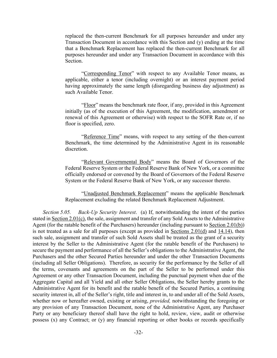 -32- replaced the then-current Benchmark for all purposes hereunder and under any Transaction Document in accordance with this Section and (y) ending at the time that a Benchmark Replacement has replaced the then-current Benchmark for all purposes hereunder and under any Transaction Document in accordance with this Section. “Corresponding Tenor” with respect to any Available Tenor means, as applicable, either a tenor (including overnight) or an interest payment period having approximately the same length (disregarding business day adjustment) as such Available Tenor. “Floor” means the benchmark rate floor, if any, provided in this Agreement initially (as of the execution of this Agreement, the modification, amendment or renewal of this Agreement or otherwise) with respect to the SOFR Rate or, if no floor is specified, zero. “Reference Time” means, with respect to any setting of the then-current Benchmark, the time determined by the Administrative Agent in its reasonable discretion. “Relevant Governmental Body” means the Board of Governors of the Federal Reserve System or the Federal Reserve Bank of New York, or a committee officially endorsed or convened by the Board of Governors of the Federal Reserve System or the Federal Reserve Bank of New York, or any successor thereto. “Unadjusted Benchmark Replacement” means the applicable Benchmark Replacement excluding the related Benchmark Replacement Adjustment. Section 5.05. Back-Up Security Interest. (a) If, notwithstanding the intent of the parties stated in Section 2.01(c), the sale, assignment and transfer of any Sold Assets to the Administrative Agent (for the ratable benefit of the Purchasers) hereunder (including pursuant to Section 2.01(b)) is not treated as a sale for all purposes (except as provided in Sections 2.01(d) and 14.14), then such sale, assignment and transfer of such Sold Assets shall be treated as the grant of a security interest by the Seller to the Administrative Agent (for the ratable benefit of the Purchasers) to secure the payment and performance of all the Seller’s obligations to the Administrative Agent, the Purchasers and the other Secured Parties hereunder and under the other Transaction Documents (including all Seller Obligations). Therefore, as security for the performance by the Seller of all the terms, covenants and agreements on the part of the Seller to be performed under this Agreement or any other Transaction Document, including the punctual payment when due of the Aggregate Capital and all Yield and all other Seller Obligations, the Seller hereby grants to the Administrative Agent for its benefit and the ratable benefit of the Secured Parties, a continuing security interest in, all of the Seller’s right, title and interest in, to and under all of the Sold Assets, whether now or hereafter owned, existing or arising, provided, notwithstanding the foregoing or any provision of any Transaction Document, none of the Administrative Agent, any Purchaser Party or any beneficiary thereof shall have the right to hold, review, view, audit or otherwise possess (x) any Contract; or (y) any financial reporting or other books or records specifically