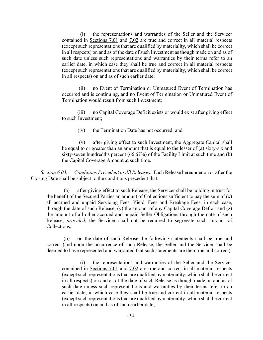 -34- (i) the representations and warranties of the Seller and the Servicer contained in Sections 7.01 and 7.02 are true and correct in all material respects (except such representations that are qualified by materiality, which shall be correct in all respects) on and as of the date of such Investment as though made on and as of such date unless such representations and warranties by their terms refer to an earlier date, in which case they shall be true and correct in all material respects (except such representations that are qualified by materiality, which shall be correct in all respects) on and as of such earlier date; (ii) no Event of Termination or Unmatured Event of Termination has occurred and is continuing, and no Event of Termination or Unmatured Event of Termination would result from such Investment; (iii) no Capital Coverage Deficit exists or would exist after giving effect to such Investment; (iv) the Termination Date has not occurred; and (v) after giving effect to such Investment, the Aggregate Capital shall be equal to or greater than an amount that is equal to the lesser of (a) sixty-six and sixty-seven hundredths percent (66.67%) of the Facility Limit at such time and (b) the Capital Coverage Amount at such time. Section 6.03. Conditions Precedent to All Releases. Each Release hereunder on or after the Closing Date shall be subject to the conditions precedent that: (a) after giving effect to such Release, the Servicer shall be holding in trust for the benefit of the Secured Parties an amount of Collections sufficient to pay the sum of (x) all accrued and unpaid Servicing Fees, Yield, Fees and Breakage Fees, in each case, through the date of such Release, (y) the amount of any Capital Coverage Deficit and (z) the amount of all other accrued and unpaid Seller Obligations through the date of such Release; provided, the Servicer shall not be required to segregate such amount of Collections; (b) on the date of such Release the following statements shall be true and correct (and upon the occurrence of such Release, the Seller and the Servicer shall be deemed to have represented and warranted that such statements are then true and correct): (i) the representations and warranties of the Seller and the Servicer contained in Sections 7.01 and 7.02 are true and correct in all material respects (except such representations that are qualified by materiality, which shall be correct in all respects) on and as of the date of such Release as though made on and as of such date unless such representations and warranties by their terms refer to an earlier date, in which case they shall be true and correct in all material respects (except such representations that are qualified by materiality, which shall be correct in all respects) on and as of such earlier date;