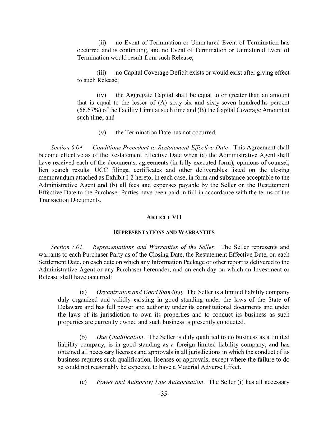 -35- (ii) no Event of Termination or Unmatured Event of Termination has occurred and is continuing, and no Event of Termination or Unmatured Event of Termination would result from such Release; (iii) no Capital Coverage Deficit exists or would exist after giving effect to such Release; (iv) the Aggregate Capital shall be equal to or greater than an amount that is equal to the lesser of (A) sixty-six and sixty-seven hundredths percent (66.67%) of the Facility Limit at such time and (B) the Capital Coverage Amount at such time; and (v) the Termination Date has not occurred. Section 6.04. Conditions Precedent to Restatement Effective Date. This Agreement shall become effective as of the Restatement Effective Date when (a) the Administrative Agent shall have received each of the documents, agreements (in fully executed form), opinions of counsel, lien search results, UCC filings, certificates and other deliverables listed on the closing memorandum attached as Exhibit I-2 hereto, in each case, in form and substance acceptable to the Administrative Agent and (b) all fees and expenses payable by the Seller on the Restatement Effective Date to the Purchaser Parties have been paid in full in accordance with the terms of the Transaction Documents. ARTICLE VII REPRESENTATIONS AND WARRANTIES Section 7.01. Representations and Warranties of the Seller. The Seller represents and warrants to each Purchaser Party as of the Closing Date, the Restatement Effective Date, on each Settlement Date, on each date on which any Information Package or other report is delivered to the Administrative Agent or any Purchaser hereunder, and on each day on which an Investment or Release shall have occurred: (a) Organization and Good Standing. The Seller is a limited liability company duly organized and validly existing in good standing under the laws of the State of Delaware and has full power and authority under its constitutional documents and under the laws of its jurisdiction to own its properties and to conduct its business as such properties are currently owned and such business is presently conducted. (b) Due Qualification. The Seller is duly qualified to do business as a limited liability company, is in good standing as a foreign limited liability company, and has obtained all necessary licenses and approvals in all jurisdictions in which the conduct of its business requires such qualification, licenses or approvals, except where the failure to do so could not reasonably be expected to have a Material Adverse Effect. (c) Power and Authority; Due Authorization. The Seller (i) has all necessary