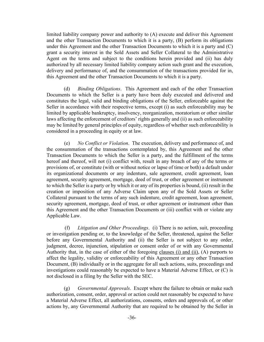 -36- limited liability company power and authority to (A) execute and deliver this Agreement and the other Transaction Documents to which it is a party, (B) perform its obligations under this Agreement and the other Transaction Documents to which it is a party and (C) grant a security interest in the Sold Assets and Seller Collateral to the Administrative Agent on the terms and subject to the conditions herein provided and (ii) has duly authorized by all necessary limited liability company action such grant and the execution, delivery and performance of, and the consummation of the transactions provided for in, this Agreement and the other Transaction Documents to which it is a party. (d) Binding Obligations. This Agreement and each of the other Transaction Documents to which the Seller is a party have been duly executed and delivered and constitutes the legal, valid and binding obligations of the Seller, enforceable against the Seller in accordance with their respective terms, except (i) as such enforceability may be limited by applicable bankruptcy, insolvency, reorganization, moratorium or other similar laws affecting the enforcement of creditors’ rights generally and (ii) as such enforceability may be limited by general principles of equity, regardless of whether such enforceability is considered in a proceeding in equity or at law. (e) No Conflict or Violation. The execution, delivery and performance of, and the consummation of the transactions contemplated by, this Agreement and the other Transaction Documents to which the Seller is a party, and the fulfillment of the terms hereof and thereof, will not (i) conflict with, result in any breach of any of the terms or provisions of, or constitute (with or without notice or lapse of time or both) a default under its organizational documents or any indenture, sale agreement, credit agreement, loan agreement, security agreement, mortgage, deed of trust, or other agreement or instrument to which the Seller is a party or by which it or any of its properties is bound, (ii) result in the creation or imposition of any Adverse Claim upon any of the Sold Assets or Seller Collateral pursuant to the terms of any such indenture, credit agreement, loan agreement, security agreement, mortgage, deed of trust, or other agreement or instrument other than this Agreement and the other Transaction Documents or (iii) conflict with or violate any Applicable Law. (f) Litigation and Other Proceedings. (i) There is no action, suit, proceeding or investigation pending or, to the knowledge of the Seller, threatened, against the Seller before any Governmental Authority and (ii) the Seller is not subject to any order, judgment, decree, injunction, stipulation or consent order of or with any Governmental Authority that, in the case of either of the foregoing clauses (i) and (ii), (A) purports to affect the legality, validity or enforceability of this Agreement or any other Transaction Document, (B) individually or in the aggregate for all such actions, suits, proceedings and investigations could reasonably be expected to have a Material Adverse Effect, or (C) is not disclosed in a filing by the Seller with the SEC. (g) Governmental Approvals. Except where the failure to obtain or make such authorization, consent, order, approval or action could not reasonably be expected to have a Material Adverse Effect, all authorizations, consents, orders and approvals of, or other actions by, any Governmental Authority that are required to be obtained by the Seller in
