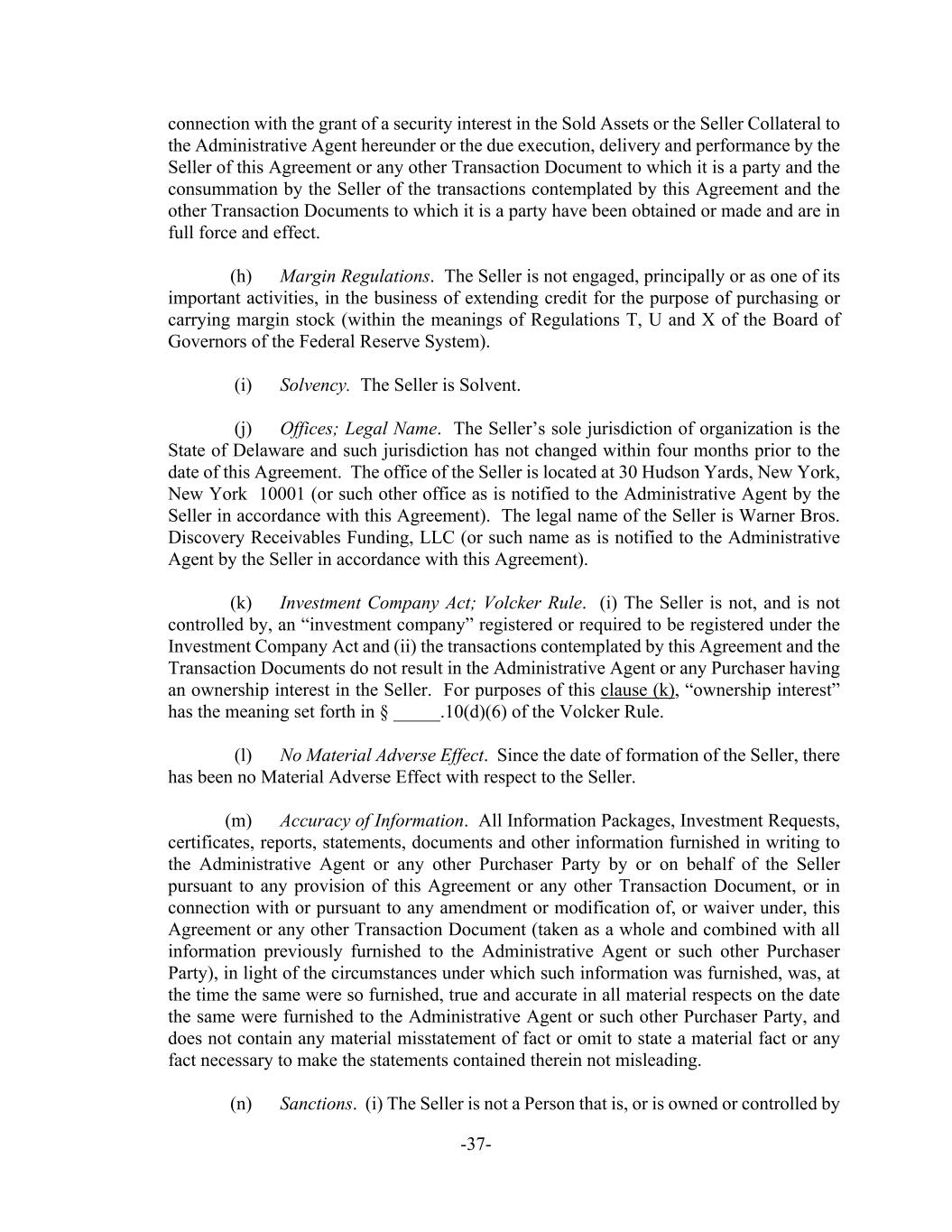-37- connection with the grant of a security interest in the Sold Assets or the Seller Collateral to the Administrative Agent hereunder or the due execution, delivery and performance by the Seller of this Agreement or any other Transaction Document to which it is a party and the consummation by the Seller of the transactions contemplated by this Agreement and the other Transaction Documents to which it is a party have been obtained or made and are in full force and effect. (h) Margin Regulations. The Seller is not engaged, principally or as one of its important activities, in the business of extending credit for the purpose of purchasing or carrying margin stock (within the meanings of Regulations T, U and X of the Board of Governors of the Federal Reserve System). (i) Solvency. The Seller is Solvent. (j) Offices; Legal Name. The Seller’s sole jurisdiction of organization is the State of Delaware and such jurisdiction has not changed within four months prior to the date of this Agreement. The office of the Seller is located at 30 Hudson Yards, New York, New York 10001 (or such other office as is notified to the Administrative Agent by the Seller in accordance with this Agreement). The legal name of the Seller is Warner Bros. Discovery Receivables Funding, LLC (or such name as is notified to the Administrative Agent by the Seller in accordance with this Agreement). (k) Investment Company Act; Volcker Rule. (i) The Seller is not, and is not controlled by, an “investment company” registered or required to be registered under the Investment Company Act and (ii) the transactions contemplated by this Agreement and the Transaction Documents do not result in the Administrative Agent or any Purchaser having an ownership interest in the Seller. For purposes of this clause (k), “ownership interest” has the meaning set forth in § _____.10(d)(6) of the Volcker Rule. (l) No Material Adverse Effect. Since the date of formation of the Seller, there has been no Material Adverse Effect with respect to the Seller. (m) Accuracy of Information. All Information Packages, Investment Requests, certificates, reports, statements, documents and other information furnished in writing to the Administrative Agent or any other Purchaser Party by or on behalf of the Seller pursuant to any provision of this Agreement or any other Transaction Document, or in connection with or pursuant to any amendment or modification of, or waiver under, this Agreement or any other Transaction Document (taken as a whole and combined with all information previously furnished to the Administrative Agent or such other Purchaser Party), in light of the circumstances under which such information was furnished, was, at the time the same were so furnished, true and accurate in all material respects on the date the same were furnished to the Administrative Agent or such other Purchaser Party, and does not contain any material misstatement of fact or omit to state a material fact or any fact necessary to make the statements contained therein not misleading. (n) Sanctions. (i) The Seller is not a Person that is, or is owned or controlled by