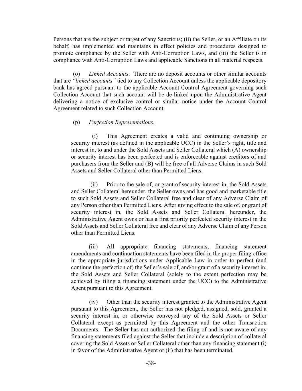 -38- Persons that are the subject or target of any Sanctions; (ii) the Seller, or an Affiliate on its behalf, has implemented and maintains in effect policies and procedures designed to promote compliance by the Seller with Anti-Corruption Laws, and (iii) the Seller is in compliance with Anti-Corruption Laws and applicable Sanctions in all material respects. (o) Linked Accounts. There are no deposit accounts or other similar accounts that are “linked accounts” tied to any Collection Account unless the applicable depository bank has agreed pursuant to the applicable Account Control Agreement governing such Collection Account that such account will be de-linked upon the Administrative Agent delivering a notice of exclusive control or similar notice under the Account Control Agreement related to such Collection Account. (p) Perfection Representations. (i) This Agreement creates a valid and continuing ownership or security interest (as defined in the applicable UCC) in the Seller’s right, title and interest in, to and under the Sold Assets and Seller Collateral which (A) ownership or security interest has been perfected and is enforceable against creditors of and purchasers from the Seller and (B) will be free of all Adverse Claims in such Sold Assets and Seller Collateral other than Permitted Liens. (ii) Prior to the sale of, or grant of security interest in, the Sold Assets and Seller Collateral hereunder, the Seller owns and has good and marketable title to such Sold Assets and Seller Collateral free and clear of any Adverse Claim of any Person other than Permitted Liens. After giving effect to the sale of, or grant of security interest in, the Sold Assets and Seller Collateral hereunder, the Administrative Agent owns or has a first priority perfected security interest in the Sold Assets and Seller Collateral free and clear of any Adverse Claim of any Person other than Permitted Liens. (iii) All appropriate financing statements, financing statement amendments and continuation statements have been filed in the proper filing office in the appropriate jurisdictions under Applicable Law in order to perfect (and continue the perfection of) the Seller’s sale of, and/or grant of a security interest in, the Sold Assets and Seller Collateral (solely to the extent perfection may be achieved by filing a financing statement under the UCC) to the Administrative Agent pursuant to this Agreement. (iv) Other than the security interest granted to the Administrative Agent pursuant to this Agreement, the Seller has not pledged, assigned, sold, granted a security interest in, or otherwise conveyed any of the Sold Assets or Seller Collateral except as permitted by this Agreement and the other Transaction Documents. The Seller has not authorized the filing of and is not aware of any financing statements filed against the Seller that include a description of collateral covering the Sold Assets or Seller Collateral other than any financing statement (i) in favor of the Administrative Agent or (ii) that has been terminated.