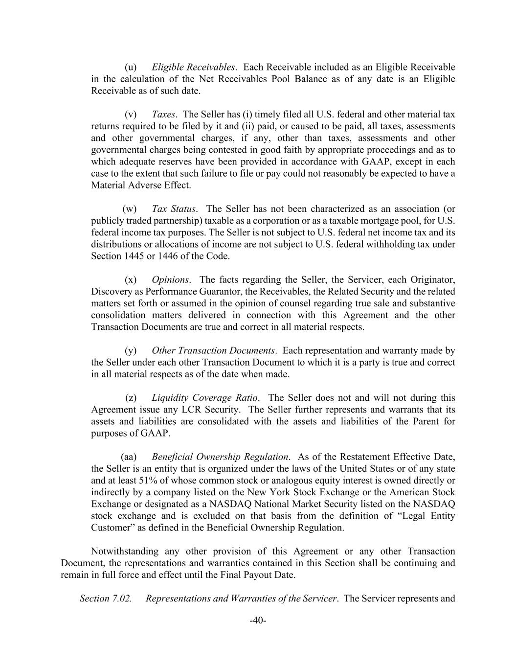 -40- (u) Eligible Receivables. Each Receivable included as an Eligible Receivable in the calculation of the Net Receivables Pool Balance as of any date is an Eligible Receivable as of such date. (v) Taxes. The Seller has (i) timely filed all U.S. federal and other material tax returns required to be filed by it and (ii) paid, or caused to be paid, all taxes, assessments and other governmental charges, if any, other than taxes, assessments and other governmental charges being contested in good faith by appropriate proceedings and as to which adequate reserves have been provided in accordance with GAAP, except in each case to the extent that such failure to file or pay could not reasonably be expected to have a Material Adverse Effect. (w) Tax Status. The Seller has not been characterized as an association (or publicly traded partnership) taxable as a corporation or as a taxable mortgage pool, for U.S. federal income tax purposes. The Seller is not subject to U.S. federal net income tax and its distributions or allocations of income are not subject to U.S. federal withholding tax under Section 1445 or 1446 of the Code. (x) Opinions. The facts regarding the Seller, the Servicer, each Originator, Discovery as Performance Guarantor, the Receivables, the Related Security and the related matters set forth or assumed in the opinion of counsel regarding true sale and substantive consolidation matters delivered in connection with this Agreement and the other Transaction Documents are true and correct in all material respects. (y) Other Transaction Documents. Each representation and warranty made by the Seller under each other Transaction Document to which it is a party is true and correct in all material respects as of the date when made. (z) Liquidity Coverage Ratio. The Seller does not and will not during this Agreement issue any LCR Security. The Seller further represents and warrants that its assets and liabilities are consolidated with the assets and liabilities of the Parent for purposes of GAAP. (aa) Beneficial Ownership Regulation. As of the Restatement Effective Date, the Seller is an entity that is organized under the laws of the United States or of any state and at least 51% of whose common stock or analogous equity interest is owned directly or indirectly by a company listed on the New York Stock Exchange or the American Stock Exchange or designated as a NASDAQ National Market Security listed on the NASDAQ stock exchange and is excluded on that basis from the definition of “Legal Entity Customer” as defined in the Beneficial Ownership Regulation. Notwithstanding any other provision of this Agreement or any other Transaction Document, the representations and warranties contained in this Section shall be continuing and remain in full force and effect until the Final Payout Date. Section 7.02. Representations and Warranties of the Servicer. The Servicer represents and