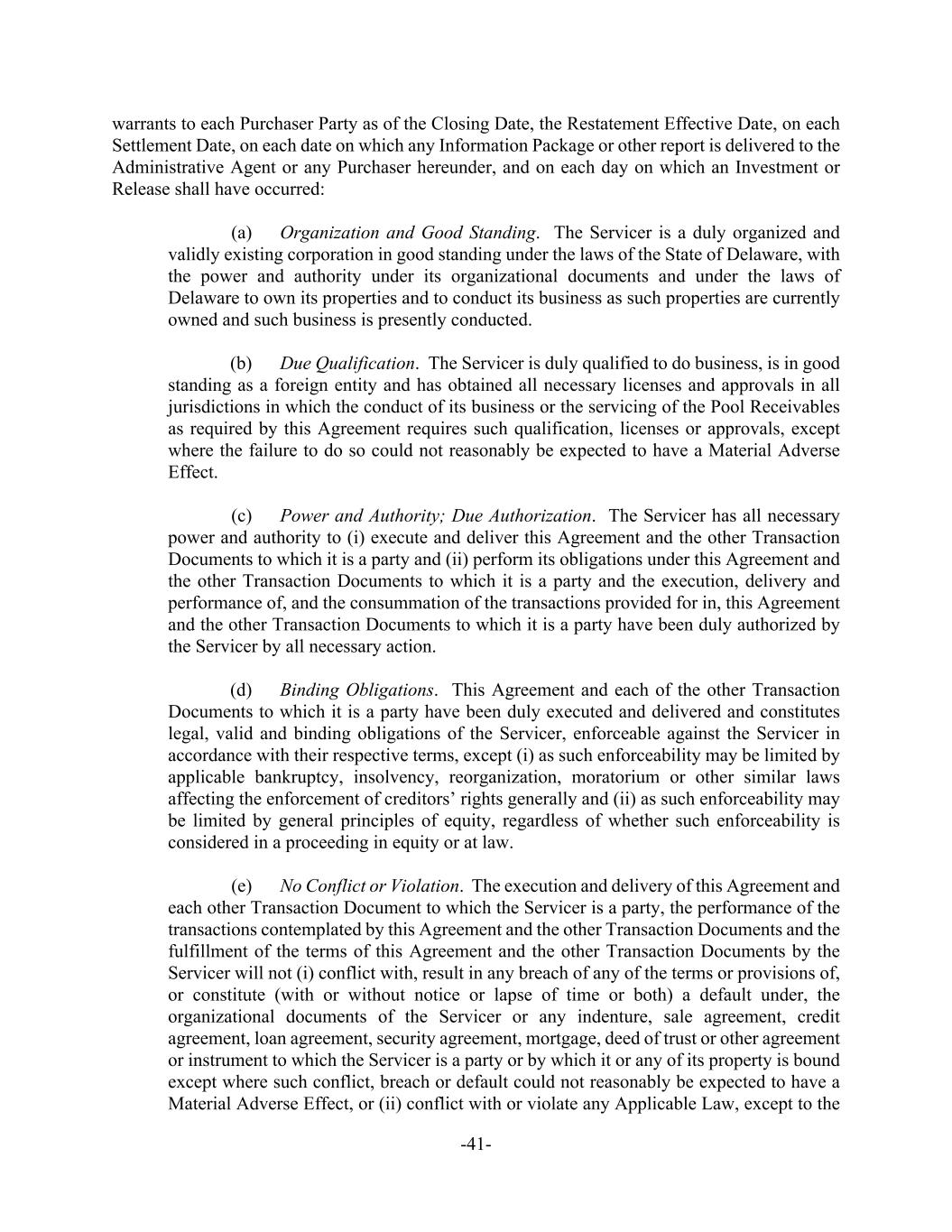 -41- warrants to each Purchaser Party as of the Closing Date, the Restatement Effective Date, on each Settlement Date, on each date on which any Information Package or other report is delivered to the Administrative Agent or any Purchaser hereunder, and on each day on which an Investment or Release shall have occurred: (a) Organization and Good Standing. The Servicer is a duly organized and validly existing corporation in good standing under the laws of the State of Delaware, with the power and authority under its organizational documents and under the laws of Delaware to own its properties and to conduct its business as such properties are currently owned and such business is presently conducted. (b) Due Qualification. The Servicer is duly qualified to do business, is in good standing as a foreign entity and has obtained all necessary licenses and approvals in all jurisdictions in which the conduct of its business or the servicing of the Pool Receivables as required by this Agreement requires such qualification, licenses or approvals, except where the failure to do so could not reasonably be expected to have a Material Adverse Effect. (c) Power and Authority; Due Authorization. The Servicer has all necessary power and authority to (i) execute and deliver this Agreement and the other Transaction Documents to which it is a party and (ii) perform its obligations under this Agreement and the other Transaction Documents to which it is a party and the execution, delivery and performance of, and the consummation of the transactions provided for in, this Agreement and the other Transaction Documents to which it is a party have been duly authorized by the Servicer by all necessary action. (d) Binding Obligations. This Agreement and each of the other Transaction Documents to which it is a party have been duly executed and delivered and constitutes legal, valid and binding obligations of the Servicer, enforceable against the Servicer in accordance with their respective terms, except (i) as such enforceability may be limited by applicable bankruptcy, insolvency, reorganization, moratorium or other similar laws affecting the enforcement of creditors’ rights generally and (ii) as such enforceability may be limited by general principles of equity, regardless of whether such enforceability is considered in a proceeding in equity or at law. (e) No Conflict or Violation. The execution and delivery of this Agreement and each other Transaction Document to which the Servicer is a party, the performance of the transactions contemplated by this Agreement and the other Transaction Documents and the fulfillment of the terms of this Agreement and the other Transaction Documents by the Servicer will not (i) conflict with, result in any breach of any of the terms or provisions of, or constitute (with or without notice or lapse of time or both) a default under, the organizational documents of the Servicer or any indenture, sale agreement, credit agreement, loan agreement, security agreement, mortgage, deed of trust or other agreement or instrument to which the Servicer is a party or by which it or any of its property is bound except where such conflict, breach or default could not reasonably be expected to have a Material Adverse Effect, or (ii) conflict with or violate any Applicable Law, except to the