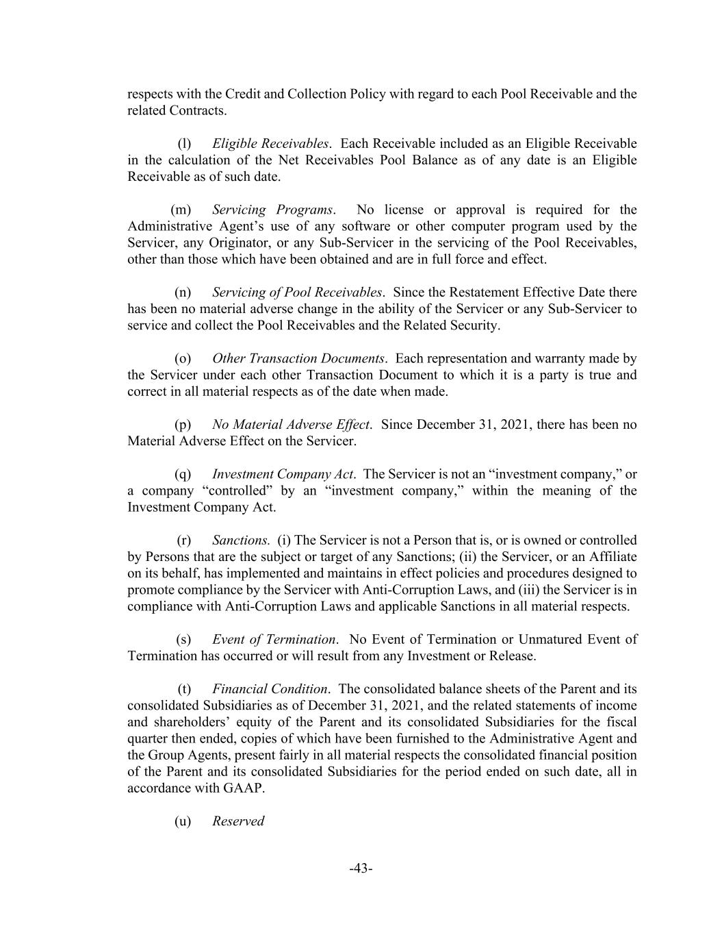 -43- respects with the Credit and Collection Policy with regard to each Pool Receivable and the related Contracts. (l) Eligible Receivables. Each Receivable included as an Eligible Receivable in the calculation of the Net Receivables Pool Balance as of any date is an Eligible Receivable as of such date. (m) Servicing Programs. No license or approval is required for the Administrative Agent’s use of any software or other computer program used by the Servicer, any Originator, or any Sub-Servicer in the servicing of the Pool Receivables, other than those which have been obtained and are in full force and effect. (n) Servicing of Pool Receivables. Since the Restatement Effective Date there has been no material adverse change in the ability of the Servicer or any Sub-Servicer to service and collect the Pool Receivables and the Related Security. (o) Other Transaction Documents. Each representation and warranty made by the Servicer under each other Transaction Document to which it is a party is true and correct in all material respects as of the date when made. (p) No Material Adverse Effect. Since December 31, 2021, there has been no Material Adverse Effect on the Servicer. (q) Investment Company Act. The Servicer is not an “investment company,” or a company “controlled” by an “investment company,” within the meaning of the Investment Company Act. (r) Sanctions. (i) The Servicer is not a Person that is, or is owned or controlled by Persons that are the subject or target of any Sanctions; (ii) the Servicer, or an Affiliate on its behalf, has implemented and maintains in effect policies and procedures designed to promote compliance by the Servicer with Anti-Corruption Laws, and (iii) the Servicer is in compliance with Anti-Corruption Laws and applicable Sanctions in all material respects. (s) Event of Termination. No Event of Termination or Unmatured Event of Termination has occurred or will result from any Investment or Release. (t) Financial Condition. The consolidated balance sheets of the Parent and its consolidated Subsidiaries as of December 31, 2021, and the related statements of income and shareholders’ equity of the Parent and its consolidated Subsidiaries for the fiscal quarter then ended, copies of which have been furnished to the Administrative Agent and the Group Agents, present fairly in all material respects the consolidated financial position of the Parent and its consolidated Subsidiaries for the period ended on such date, all in accordance with GAAP. (u) Reserved