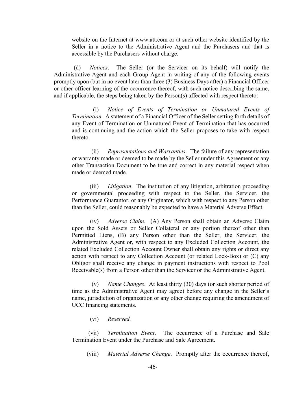 -46- website on the Internet at www.att.com or at such other website identified by the Seller in a notice to the Administrative Agent and the Purchasers and that is accessible by the Purchasers without charge. (d) Notices. The Seller (or the Servicer on its behalf) will notify the Administrative Agent and each Group Agent in writing of any of the following events promptly upon (but in no event later than three (3) Business Days after) a Financial Officer or other officer learning of the occurrence thereof, with such notice describing the same, and if applicable, the steps being taken by the Person(s) affected with respect thereto: (i) Notice of Events of Termination or Unmatured Events of Termination. A statement of a Financial Officer of the Seller setting forth details of any Event of Termination or Unmatured Event of Termination that has occurred and is continuing and the action which the Seller proposes to take with respect thereto. (ii) Representations and Warranties. The failure of any representation or warranty made or deemed to be made by the Seller under this Agreement or any other Transaction Document to be true and correct in any material respect when made or deemed made. (iii) Litigation. The institution of any litigation, arbitration proceeding or governmental proceeding with respect to the Seller, the Servicer, the Performance Guarantor, or any Originator, which with respect to any Person other than the Seller, could reasonably be expected to have a Material Adverse Effect. (iv) Adverse Claim. (A) Any Person shall obtain an Adverse Claim upon the Sold Assets or Seller Collateral or any portion thereof other than Permitted Liens, (B) any Person other than the Seller, the Servicer, the Administrative Agent or, with respect to any Excluded Collection Account, the related Excluded Collection Account Owner shall obtain any rights or direct any action with respect to any Collection Account (or related Lock-Box) or (C) any Obligor shall receive any change in payment instructions with respect to Pool Receivable(s) from a Person other than the Servicer or the Administrative Agent. (v) Name Changes. At least thirty (30) days (or such shorter period of time as the Administrative Agent may agree) before any change in the Seller’s name, jurisdiction of organization or any other change requiring the amendment of UCC financing statements. (vi) Reserved. (vii) Termination Event. The occurrence of a Purchase and Sale Termination Event under the Purchase and Sale Agreement. (viii) Material Adverse Change. Promptly after the occurrence thereof,