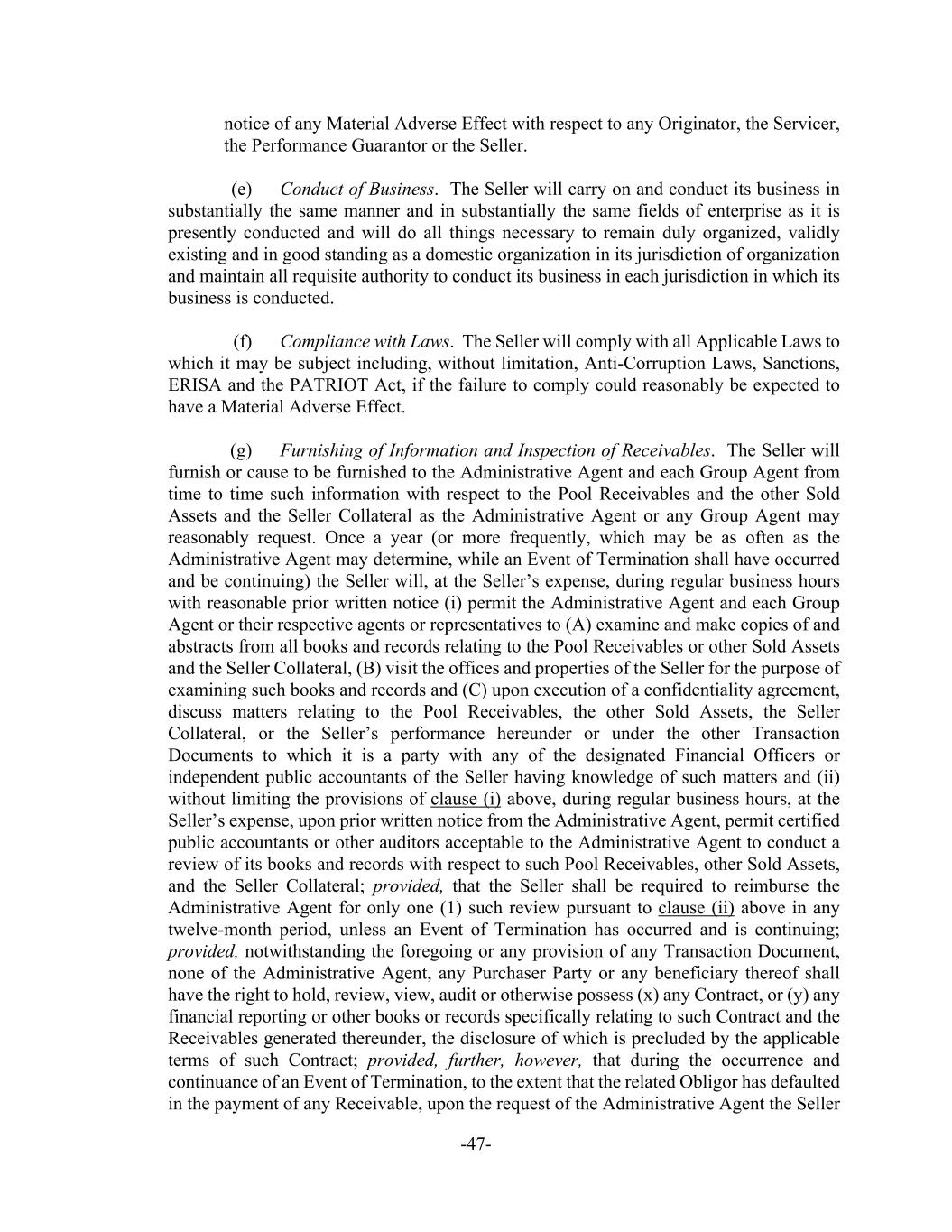 -47- notice of any Material Adverse Effect with respect to any Originator, the Servicer, the Performance Guarantor or the Seller. (e) Conduct of Business. The Seller will carry on and conduct its business in substantially the same manner and in substantially the same fields of enterprise as it is presently conducted and will do all things necessary to remain duly organized, validly existing and in good standing as a domestic organization in its jurisdiction of organization and maintain all requisite authority to conduct its business in each jurisdiction in which its business is conducted. (f) Compliance with Laws. The Seller will comply with all Applicable Laws to which it may be subject including, without limitation, Anti-Corruption Laws, Sanctions, ERISA and the PATRIOT Act, if the failure to comply could reasonably be expected to have a Material Adverse Effect. (g) Furnishing of Information and Inspection of Receivables. The Seller will furnish or cause to be furnished to the Administrative Agent and each Group Agent from time to time such information with respect to the Pool Receivables and the other Sold Assets and the Seller Collateral as the Administrative Agent or any Group Agent may reasonably request. Once a year (or more frequently, which may be as often as the Administrative Agent may determine, while an Event of Termination shall have occurred and be continuing) the Seller will, at the Seller’s expense, during regular business hours with reasonable prior written notice (i) permit the Administrative Agent and each Group Agent or their respective agents or representatives to (A) examine and make copies of and abstracts from all books and records relating to the Pool Receivables or other Sold Assets and the Seller Collateral, (B) visit the offices and properties of the Seller for the purpose of examining such books and records and (C) upon execution of a confidentiality agreement, discuss matters relating to the Pool Receivables, the other Sold Assets, the Seller Collateral, or the Seller’s performance hereunder or under the other Transaction Documents to which it is a party with any of the designated Financial Officers or independent public accountants of the Seller having knowledge of such matters and (ii) without limiting the provisions of clause (i) above, during regular business hours, at the Seller’s expense, upon prior written notice from the Administrative Agent, permit certified public accountants or other auditors acceptable to the Administrative Agent to conduct a review of its books and records with respect to such Pool Receivables, other Sold Assets, and the Seller Collateral; provided, that the Seller shall be required to reimburse the Administrative Agent for only one (1) such review pursuant to clause (ii) above in any twelve-month period, unless an Event of Termination has occurred and is continuing; provided, notwithstanding the foregoing or any provision of any Transaction Document, none of the Administrative Agent, any Purchaser Party or any beneficiary thereof shall have the right to hold, review, view, audit or otherwise possess (x) any Contract, or (y) any financial reporting or other books or records specifically relating to such Contract and the Receivables generated thereunder, the disclosure of which is precluded by the applicable terms of such Contract; provided, further, however, that during the occurrence and continuance of an Event of Termination, to the extent that the related Obligor has defaulted in the payment of any Receivable, upon the request of the Administrative Agent the Seller