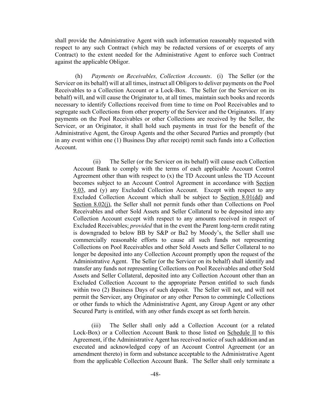 -48- shall provide the Administrative Agent with such information reasonably requested with respect to any such Contract (which may be redacted versions of or excerpts of any Contract) to the extent needed for the Administrative Agent to enforce such Contract against the applicable Obligor. (h) Payments on Receivables, Collection Accounts. (i) The Seller (or the Servicer on its behalf) will at all times, instruct all Obligors to deliver payments on the Pool Receivables to a Collection Account or a Lock-Box. The Seller (or the Servicer on its behalf) will, and will cause the Originator to, at all times, maintain such books and records necessary to identify Collections received from time to time on Pool Receivables and to segregate such Collections from other property of the Servicer and the Originators. If any payments on the Pool Receivables or other Collections are received by the Seller, the Servicer, or an Originator, it shall hold such payments in trust for the benefit of the Administrative Agent, the Group Agents and the other Secured Parties and promptly (but in any event within one (1) Business Day after receipt) remit such funds into a Collection Account. (ii) The Seller (or the Servicer on its behalf) will cause each Collection Account Bank to comply with the terms of each applicable Account Control Agreement other than with respect to (x) the TD Account unless the TD Account becomes subject to an Account Control Agreement in accordance with Section 9.03, and (y) any Excluded Collection Account. Except with respect to any Excluded Collection Account which shall be subject to Section 8.01(dd) and Section 8.02(j), the Seller shall not permit funds other than Collections on Pool Receivables and other Sold Assets and Seller Collateral to be deposited into any Collection Account except with respect to any amounts received in respect of Excluded Receivables; provided that in the event the Parent long-term credit rating is downgraded to below BB by S&P or Ba2 by Moody’s, the Seller shall use commercially reasonable efforts to cause all such funds not representing Collections on Pool Receivables and other Sold Assets and Seller Collateral to no longer be deposited into any Collection Account promptly upon the request of the Administrative Agent. The Seller (or the Servicer on its behalf) shall identify and transfer any funds not representing Collections on Pool Receivables and other Sold Assets and Seller Collateral, deposited into any Collection Account other than an Excluded Collection Account to the appropriate Person entitled to such funds within two (2) Business Days of such deposit. The Seller will not, and will not permit the Servicer, any Originator or any other Person to commingle Collections or other funds to which the Administrative Agent, any Group Agent or any other Secured Party is entitled, with any other funds except as set forth herein. (iii) The Seller shall only add a Collection Account (or a related Lock-Box) or a Collection Account Bank to those listed on Schedule II to this Agreement, if the Administrative Agent has received notice of such addition and an executed and acknowledged copy of an Account Control Agreement (or an amendment thereto) in form and substance acceptable to the Administrative Agent from the applicable Collection Account Bank. The Seller shall only terminate a