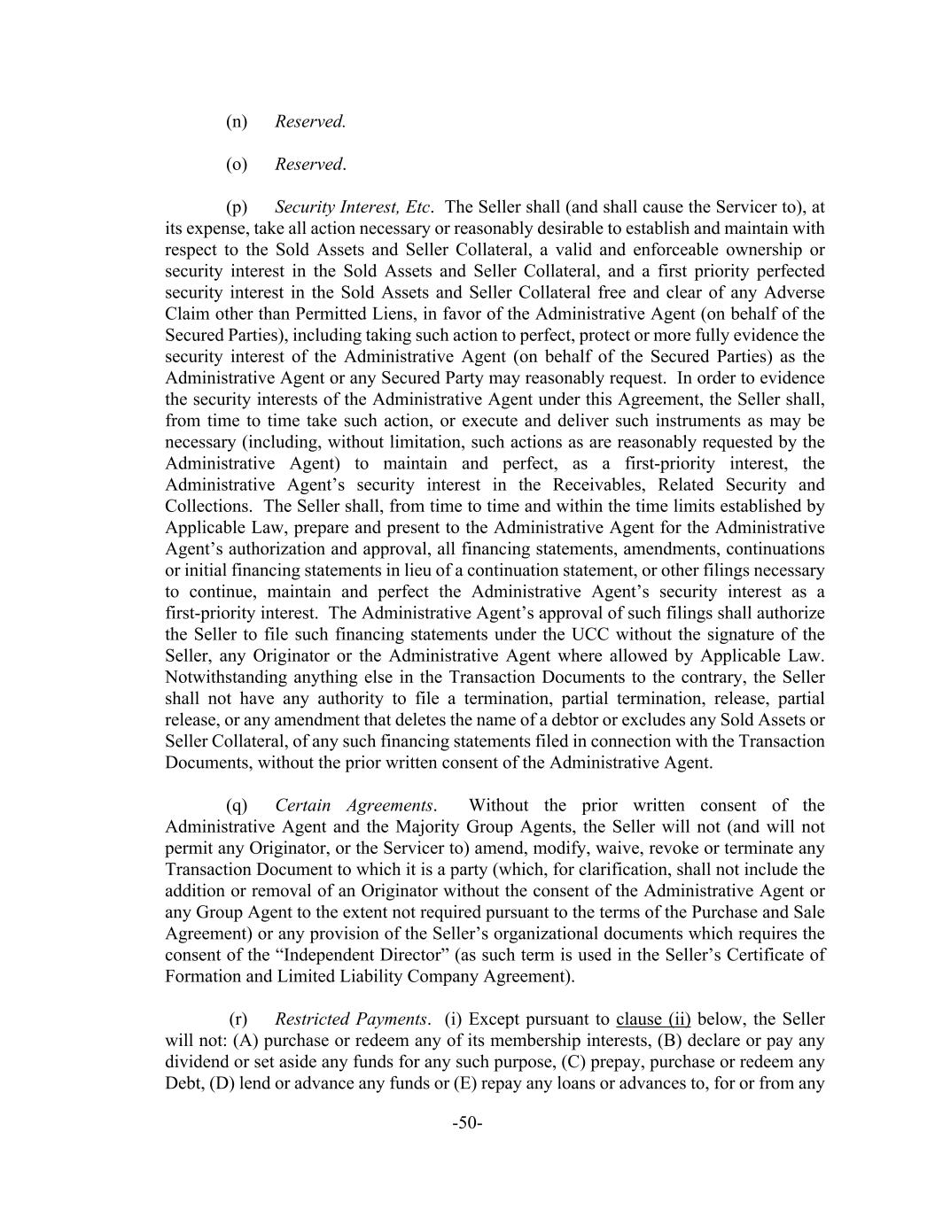 -50- (n) Reserved. (o) Reserved. (p) Security Interest, Etc. The Seller shall (and shall cause the Servicer to), at its expense, take all action necessary or reasonably desirable to establish and maintain with respect to the Sold Assets and Seller Collateral, a valid and enforceable ownership or security interest in the Sold Assets and Seller Collateral, and a first priority perfected security interest in the Sold Assets and Seller Collateral free and clear of any Adverse Claim other than Permitted Liens, in favor of the Administrative Agent (on behalf of the Secured Parties), including taking such action to perfect, protect or more fully evidence the security interest of the Administrative Agent (on behalf of the Secured Parties) as the Administrative Agent or any Secured Party may reasonably request. In order to evidence the security interests of the Administrative Agent under this Agreement, the Seller shall, from time to time take such action, or execute and deliver such instruments as may be necessary (including, without limitation, such actions as are reasonably requested by the Administrative Agent) to maintain and perfect, as a first-priority interest, the Administrative Agent’s security interest in the Receivables, Related Security and Collections. The Seller shall, from time to time and within the time limits established by Applicable Law, prepare and present to the Administrative Agent for the Administrative Agent’s authorization and approval, all financing statements, amendments, continuations or initial financing statements in lieu of a continuation statement, or other filings necessary to continue, maintain and perfect the Administrative Agent’s security interest as a first-priority interest. The Administrative Agent’s approval of such filings shall authorize the Seller to file such financing statements under the UCC without the signature of the Seller, any Originator or the Administrative Agent where allowed by Applicable Law. Notwithstanding anything else in the Transaction Documents to the contrary, the Seller shall not have any authority to file a termination, partial termination, release, partial release, or any amendment that deletes the name of a debtor or excludes any Sold Assets or Seller Collateral, of any such financing statements filed in connection with the Transaction Documents, without the prior written consent of the Administrative Agent. (q) Certain Agreements. Without the prior written consent of the Administrative Agent and the Majority Group Agents, the Seller will not (and will not permit any Originator, or the Servicer to) amend, modify, waive, revoke or terminate any Transaction Document to which it is a party (which, for clarification, shall not include the addition or removal of an Originator without the consent of the Administrative Agent or any Group Agent to the extent not required pursuant to the terms of the Purchase and Sale Agreement) or any provision of the Seller’s organizational documents which requires the consent of the “Independent Director” (as such term is used in the Seller’s Certificate of Formation and Limited Liability Company Agreement). (r) Restricted Payments. (i) Except pursuant to clause (ii) below, the Seller will not: (A) purchase or redeem any of its membership interests, (B) declare or pay any dividend or set aside any funds for any such purpose, (C) prepay, purchase or redeem any Debt, (D) lend or advance any funds or (E) repay any loans or advances to, for or from any