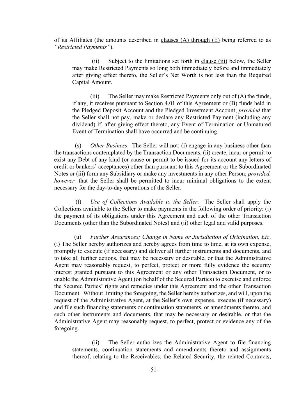 -51- of its Affiliates (the amounts described in clauses (A) through (E) being referred to as “Restricted Payments”). (ii) Subject to the limitations set forth in clause (iii) below, the Seller may make Restricted Payments so long both immediately before and immediately after giving effect thereto, the Seller’s Net Worth is not less than the Required Capital Amount. (iii) The Seller may make Restricted Payments only out of (A) the funds, if any, it receives pursuant to Section 4.01 of this Agreement or (B) funds held in the Pledged Deposit Account and the Pledged Investment Account; provided that the Seller shall not pay, make or declare any Restricted Payment (including any dividend) if, after giving effect thereto, any Event of Termination or Unmatured Event of Termination shall have occurred and be continuing. (s) Other Business. The Seller will not: (i) engage in any business other than the transactions contemplated by the Transaction Documents, (ii) create, incur or permit to exist any Debt of any kind (or cause or permit to be issued for its account any letters of credit or bankers’ acceptances) other than pursuant to this Agreement or the Subordinated Notes or (iii) form any Subsidiary or make any investments in any other Person; provided, however, that the Seller shall be permitted to incur minimal obligations to the extent necessary for the day-to-day operations of the Seller. (t) Use of Collections Available to the Seller. The Seller shall apply the Collections available to the Seller to make payments in the following order of priority: (i) the payment of its obligations under this Agreement and each of the other Transaction Documents (other than the Subordinated Notes) and (ii) other legal and valid purposes. (u) Further Assurances; Change in Name or Jurisdiction of Origination, Etc. (i) The Seller hereby authorizes and hereby agrees from time to time, at its own expense, promptly to execute (if necessary) and deliver all further instruments and documents, and to take all further actions, that may be necessary or desirable, or that the Administrative Agent may reasonably request, to perfect, protect or more fully evidence the security interest granted pursuant to this Agreement or any other Transaction Document, or to enable the Administrative Agent (on behalf of the Secured Parties) to exercise and enforce the Secured Parties’ rights and remedies under this Agreement and the other Transaction Document. Without limiting the foregoing, the Seller hereby authorizes, and will, upon the request of the Administrative Agent, at the Seller’s own expense, execute (if necessary) and file such financing statements or continuation statements, or amendments thereto, and such other instruments and documents, that may be necessary or desirable, or that the Administrative Agent may reasonably request, to perfect, protect or evidence any of the foregoing. (ii) The Seller authorizes the Administrative Agent to file financing statements, continuation statements and amendments thereto and assignments thereof, relating to the Receivables, the Related Security, the related Contracts,