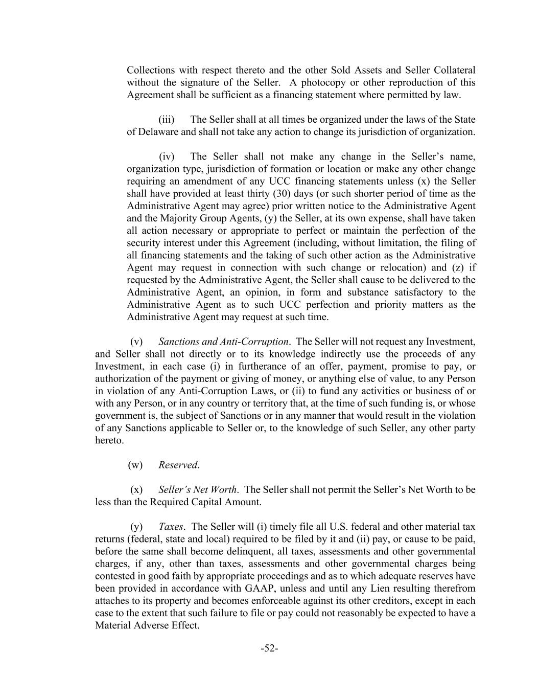 -52- Collections with respect thereto and the other Sold Assets and Seller Collateral without the signature of the Seller. A photocopy or other reproduction of this Agreement shall be sufficient as a financing statement where permitted by law. (iii) The Seller shall at all times be organized under the laws of the State of Delaware and shall not take any action to change its jurisdiction of organization. (iv) The Seller shall not make any change in the Seller’s name, organization type, jurisdiction of formation or location or make any other change requiring an amendment of any UCC financing statements unless (x) the Seller shall have provided at least thirty (30) days (or such shorter period of time as the Administrative Agent may agree) prior written notice to the Administrative Agent and the Majority Group Agents, (y) the Seller, at its own expense, shall have taken all action necessary or appropriate to perfect or maintain the perfection of the security interest under this Agreement (including, without limitation, the filing of all financing statements and the taking of such other action as the Administrative Agent may request in connection with such change or relocation) and (z) if requested by the Administrative Agent, the Seller shall cause to be delivered to the Administrative Agent, an opinion, in form and substance satisfactory to the Administrative Agent as to such UCC perfection and priority matters as the Administrative Agent may request at such time. (v) Sanctions and Anti-Corruption. The Seller will not request any Investment, and Seller shall not directly or to its knowledge indirectly use the proceeds of any Investment, in each case (i) in furtherance of an offer, payment, promise to pay, or authorization of the payment or giving of money, or anything else of value, to any Person in violation of any Anti-Corruption Laws, or (ii) to fund any activities or business of or with any Person, or in any country or territory that, at the time of such funding is, or whose government is, the subject of Sanctions or in any manner that would result in the violation of any Sanctions applicable to Seller or, to the knowledge of such Seller, any other party hereto. (w) Reserved. (x) Seller’s Net Worth. The Seller shall not permit the Seller’s Net Worth to be less than the Required Capital Amount. (y) Taxes. The Seller will (i) timely file all U.S. federal and other material tax returns (federal, state and local) required to be filed by it and (ii) pay, or cause to be paid, before the same shall become delinquent, all taxes, assessments and other governmental charges, if any, other than taxes, assessments and other governmental charges being contested in good faith by appropriate proceedings and as to which adequate reserves have been provided in accordance with GAAP, unless and until any Lien resulting therefrom attaches to its property and becomes enforceable against its other creditors, except in each case to the extent that such failure to file or pay could not reasonably be expected to have a Material Adverse Effect.
