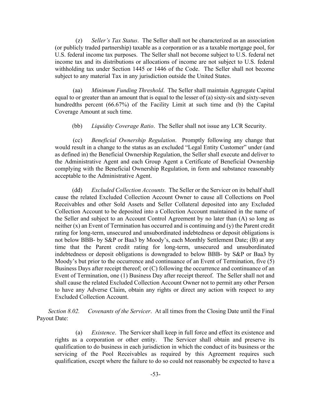 -53- (z) Seller’s Tax Status. The Seller shall not be characterized as an association (or publicly traded partnership) taxable as a corporation or as a taxable mortgage pool, for U.S. federal income tax purposes. The Seller shall not become subject to U.S. federal net income tax and its distributions or allocations of income are not subject to U.S. federal withholding tax under Section 1445 or 1446 of the Code. The Seller shall not become subject to any material Tax in any jurisdiction outside the United States. (aa) Minimum Funding Threshold. The Seller shall maintain Aggregate Capital equal to or greater than an amount that is equal to the lesser of (a) sixty-six and sixty-seven hundredths percent (66.67%) of the Facility Limit at such time and (b) the Capital Coverage Amount at such time. (bb) Liquidity Coverage Ratio. The Seller shall not issue any LCR Security. (cc) Beneficial Ownership Regulation. Promptly following any change that would result in a change to the status as an excluded “Legal Entity Customer” under (and as defined in) the Beneficial Ownership Regulation, the Seller shall execute and deliver to the Administrative Agent and each Group Agent a Certificate of Beneficial Ownership complying with the Beneficial Ownership Regulation, in form and substance reasonably acceptable to the Administrative Agent. (dd) Excluded Collection Accounts. The Seller or the Servicer on its behalf shall cause the related Excluded Collection Account Owner to cause all Collections on Pool Receivables and other Sold Assets and Seller Collateral deposited into any Excluded Collection Account to be deposited into a Collection Account maintained in the name of the Seller and subject to an Account Control Agreement by no later than (A) so long as neither (x) an Event of Termination has occurred and is continuing and (y) the Parent credit rating for long-term, unsecured and unsubordinated indebtedness or deposit obligations is not below BBB- by S&P or Baa3 by Moody’s, each Monthly Settlement Date; (B) at any time that the Parent credit rating for long-term, unsecured and unsubordinated indebtedness or deposit obligations is downgraded to below BBB- by S&P or Baa3 by Moody’s but prior to the occurrence and continuance of an Event of Termination, five (5) Business Days after receipt thereof; or (C) following the occurrence and continuance of an Event of Termination, one (1) Business Day after receipt thereof. The Seller shall not and shall cause the related Excluded Collection Account Owner not to permit any other Person to have any Adverse Claim, obtain any rights or direct any action with respect to any Excluded Collection Account. Section 8.02. Covenants of the Servicer. At all times from the Closing Date until the Final Payout Date: (a) Existence. The Servicer shall keep in full force and effect its existence and rights as a corporation or other entity. The Servicer shall obtain and preserve its qualification to do business in each jurisdiction in which the conduct of its business or the servicing of the Pool Receivables as required by this Agreement requires such qualification, except where the failure to do so could not reasonably be expected to have a