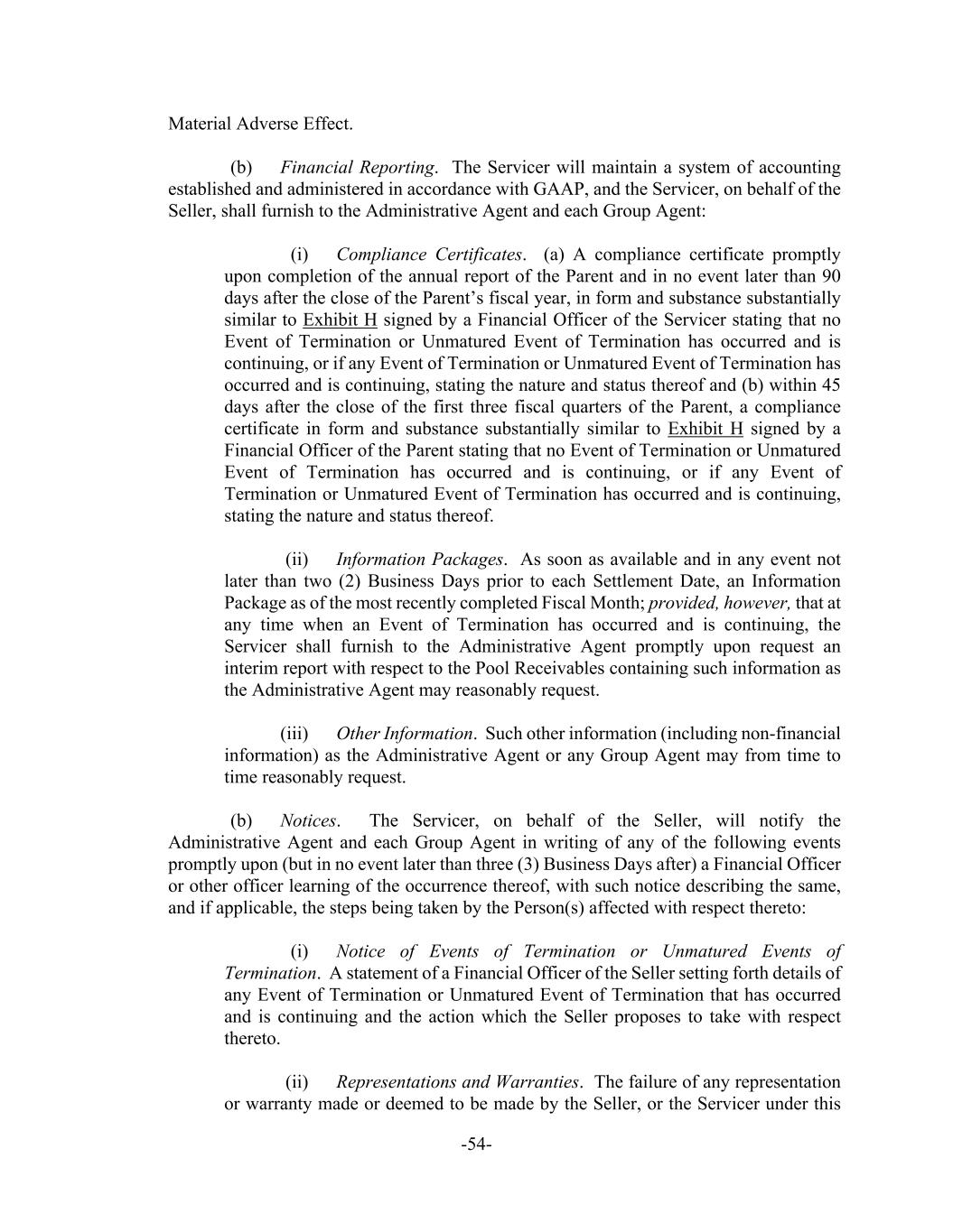 -54- Material Adverse Effect. (b) Financial Reporting. The Servicer will maintain a system of accounting established and administered in accordance with GAAP, and the Servicer, on behalf of the Seller, shall furnish to the Administrative Agent and each Group Agent: (i) Compliance Certificates. (a) A compliance certificate promptly upon completion of the annual report of the Parent and in no event later than 90 days after the close of the Parent’s fiscal year, in form and substance substantially similar to Exhibit H signed by a Financial Officer of the Servicer stating that no Event of Termination or Unmatured Event of Termination has occurred and is continuing, or if any Event of Termination or Unmatured Event of Termination has occurred and is continuing, stating the nature and status thereof and (b) within 45 days after the close of the first three fiscal quarters of the Parent, a compliance certificate in form and substance substantially similar to Exhibit H signed by a Financial Officer of the Parent stating that no Event of Termination or Unmatured Event of Termination has occurred and is continuing, or if any Event of Termination or Unmatured Event of Termination has occurred and is continuing, stating the nature and status thereof. (ii) Information Packages. As soon as available and in any event not later than two (2) Business Days prior to each Settlement Date, an Information Package as of the most recently completed Fiscal Month; provided, however, that at any time when an Event of Termination has occurred and is continuing, the Servicer shall furnish to the Administrative Agent promptly upon request an interim report with respect to the Pool Receivables containing such information as the Administrative Agent may reasonably request. (iii) Other Information. Such other information (including non-financial information) as the Administrative Agent or any Group Agent may from time to time reasonably request. (b) Notices. The Servicer, on behalf of the Seller, will notify the Administrative Agent and each Group Agent in writing of any of the following events promptly upon (but in no event later than three (3) Business Days after) a Financial Officer or other officer learning of the occurrence thereof, with such notice describing the same, and if applicable, the steps being taken by the Person(s) affected with respect thereto: (i) Notice of Events of Termination or Unmatured Events of Termination. A statement of a Financial Officer of the Seller setting forth details of any Event of Termination or Unmatured Event of Termination that has occurred and is continuing and the action which the Seller proposes to take with respect thereto. (ii) Representations and Warranties. The failure of any representation or warranty made or deemed to be made by the Seller, or the Servicer under this