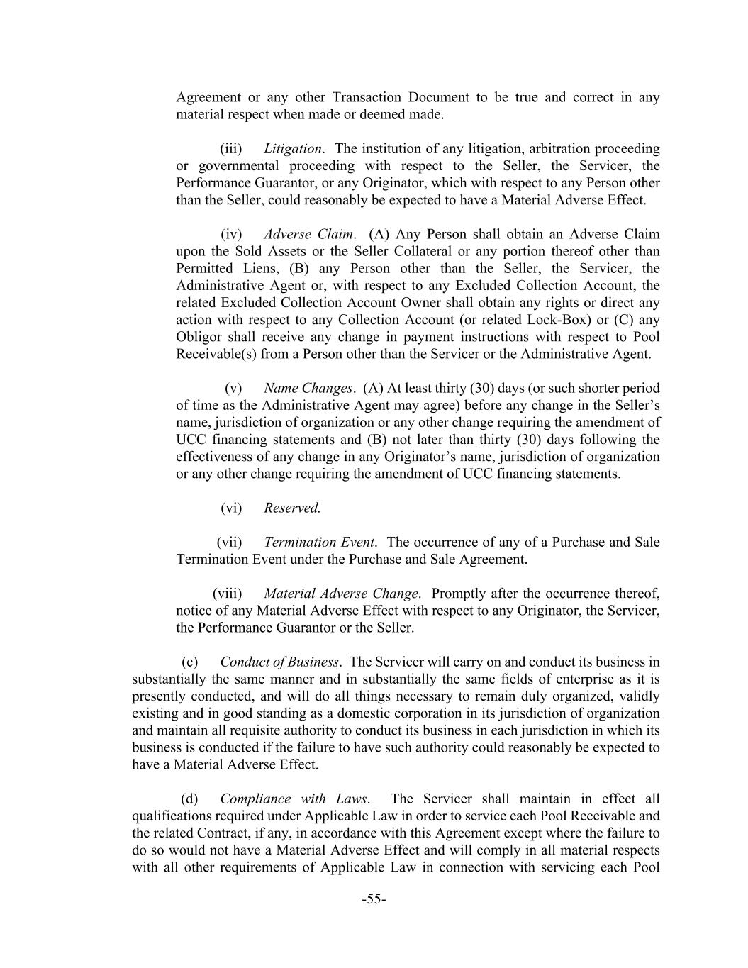 -55- Agreement or any other Transaction Document to be true and correct in any material respect when made or deemed made. (iii) Litigation. The institution of any litigation, arbitration proceeding or governmental proceeding with respect to the Seller, the Servicer, the Performance Guarantor, or any Originator, which with respect to any Person other than the Seller, could reasonably be expected to have a Material Adverse Effect. (iv) Adverse Claim. (A) Any Person shall obtain an Adverse Claim upon the Sold Assets or the Seller Collateral or any portion thereof other than Permitted Liens, (B) any Person other than the Seller, the Servicer, the Administrative Agent or, with respect to any Excluded Collection Account, the related Excluded Collection Account Owner shall obtain any rights or direct any action with respect to any Collection Account (or related Lock-Box) or (C) any Obligor shall receive any change in payment instructions with respect to Pool Receivable(s) from a Person other than the Servicer or the Administrative Agent. (v) Name Changes. (A) At least thirty (30) days (or such shorter period of time as the Administrative Agent may agree) before any change in the Seller’s name, jurisdiction of organization or any other change requiring the amendment of UCC financing statements and (B) not later than thirty (30) days following the effectiveness of any change in any Originator’s name, jurisdiction of organization or any other change requiring the amendment of UCC financing statements. (vi) Reserved. (vii) Termination Event. The occurrence of any of a Purchase and Sale Termination Event under the Purchase and Sale Agreement. (viii) Material Adverse Change. Promptly after the occurrence thereof, notice of any Material Adverse Effect with respect to any Originator, the Servicer, the Performance Guarantor or the Seller. (c) Conduct of Business. The Servicer will carry on and conduct its business in substantially the same manner and in substantially the same fields of enterprise as it is presently conducted, and will do all things necessary to remain duly organized, validly existing and in good standing as a domestic corporation in its jurisdiction of organization and maintain all requisite authority to conduct its business in each jurisdiction in which its business is conducted if the failure to have such authority could reasonably be expected to have a Material Adverse Effect. (d) Compliance with Laws. The Servicer shall maintain in effect all qualifications required under Applicable Law in order to service each Pool Receivable and the related Contract, if any, in accordance with this Agreement except where the failure to do so would not have a Material Adverse Effect and will comply in all material respects with all other requirements of Applicable Law in connection with servicing each Pool